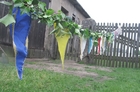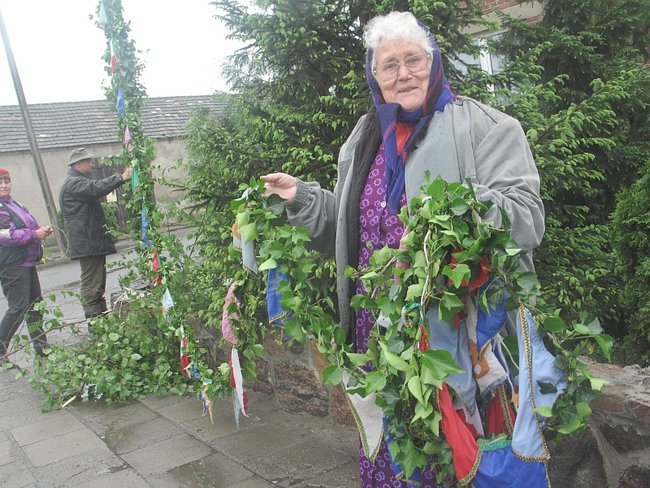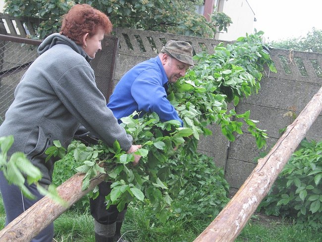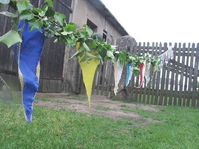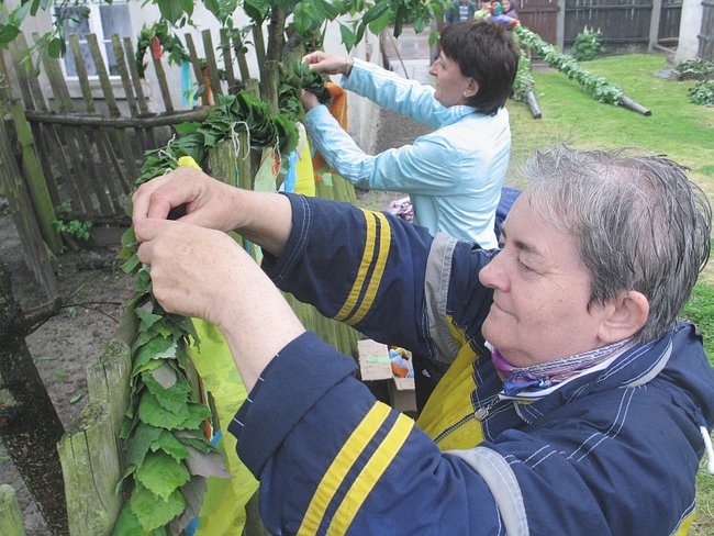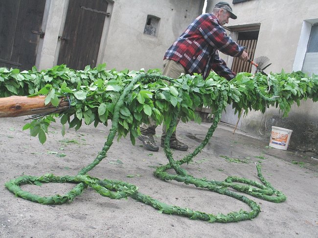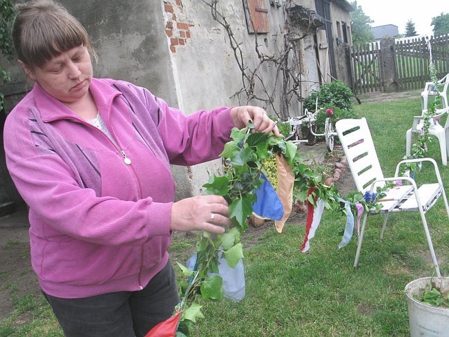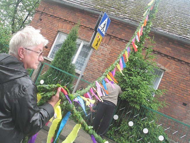- A pewnie! Dwadzieścia pięć lat pletłam, chociaż nie jestem stąd... Kiedyś to bramy były co półtora metrów! Oj, pięknie było.... Na pewno bym pletła ciągle... To taka piękna tradycja... ale ludziom się już nie chce... I ja spasowałam. W tym roku po raz pierwszy sztuczną girlandę mieć będziemy. Sztuczny bluszcz! Miałam już dość marudzenia męża, że musi mi pomagać... I tak nie ma już tego uroku, co kiedyś... - żali się kobieta i pokazuje sznur owinięty sztucznym bluszczem wiszący na płocie. Obok gotowy już umajony ,,żywymi’’ gałązkami słup.
