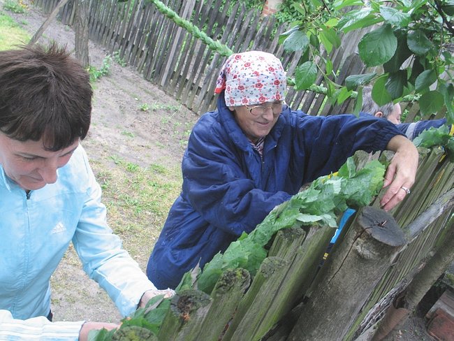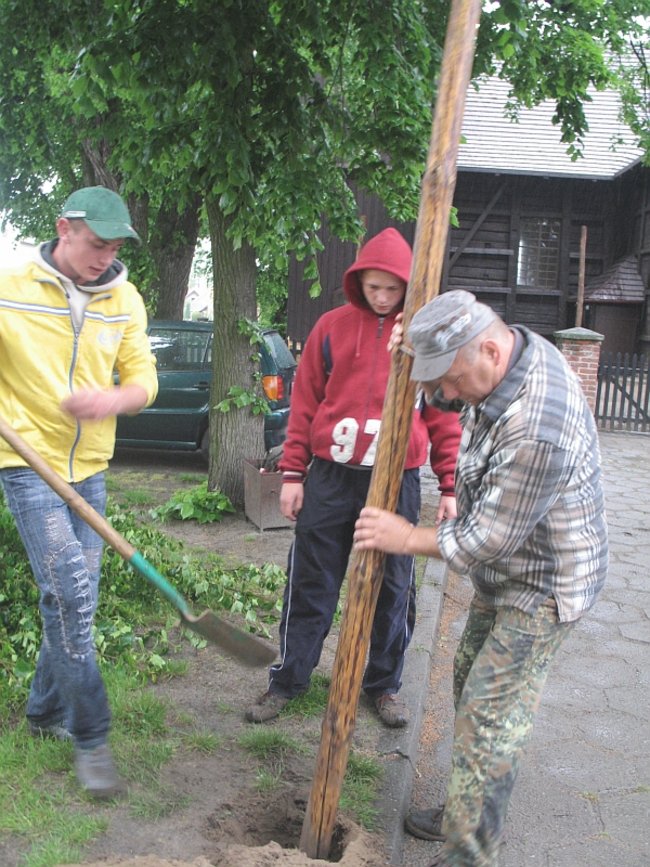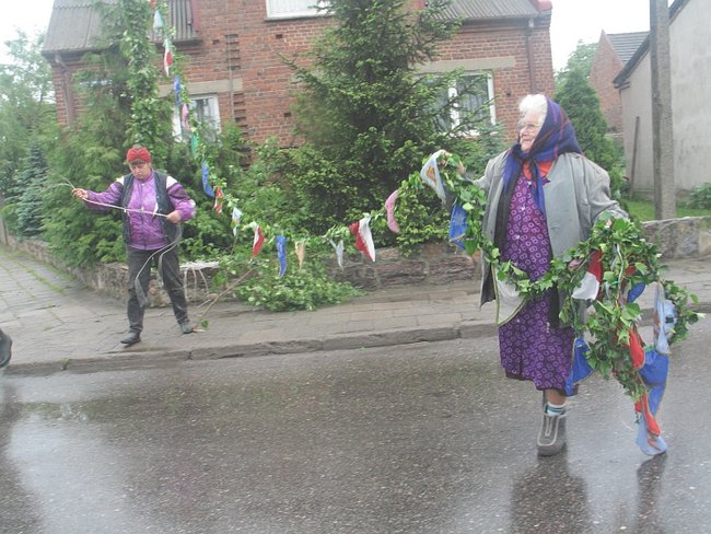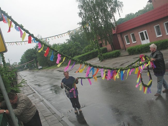 - Te dzisiejsze bramy, to już tego uroku co dawne nie mają, bo dłuższe są i wysoko wiszą. Za księdza Jazdończyka, to bramy tylko na szerokość drogi były, a zielone girlandy wisiały nisko. Ale teraz tiry muszą przejechać, to bramy muszą być szerokie tak, żeby dwa tiry się minęły, i wysokie na jakie pięć metrów, żeby przejechały. I z gałązek pleść niebezpiecznie, bo jak się liście wody napiją, to się girlanda obwiesi i jeszcze jaki tir zahaczy - wylicza Maria Konieczna. Ma 89 lat. Girlandę pletła w tym roku z liści klonu razem z sąsiadką, panią Mirosławą i córkami: Marią i Teresą.