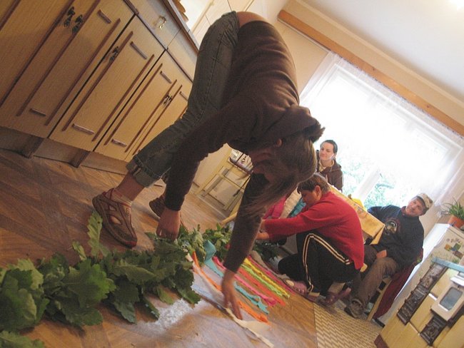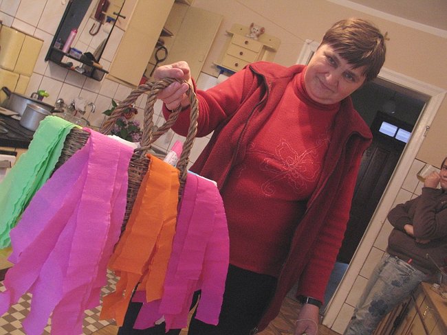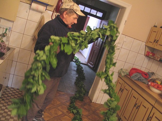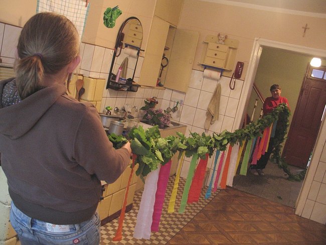 Girlandę z dębowych gałązek - zbliżoną do opisu pani Sosińskiej- znajduję u państwa Sierackich w kuchni. Upletła ją pani Grażyna, a około godz. 18.30 ozdabiała ją krepowymi wstążkami.