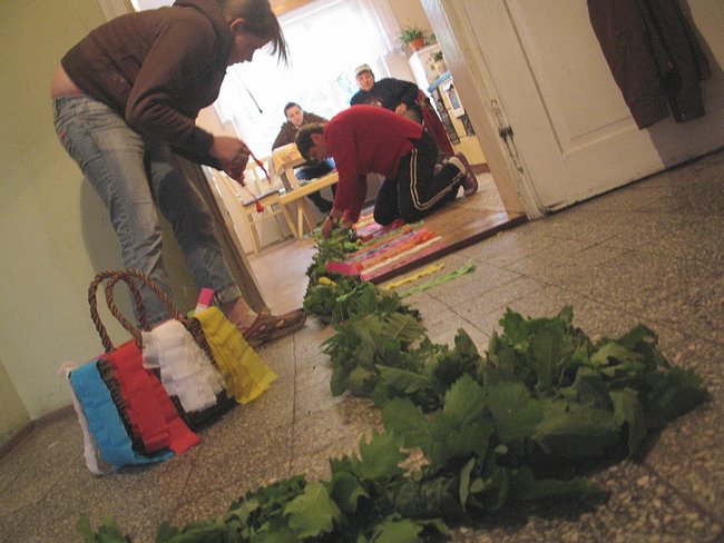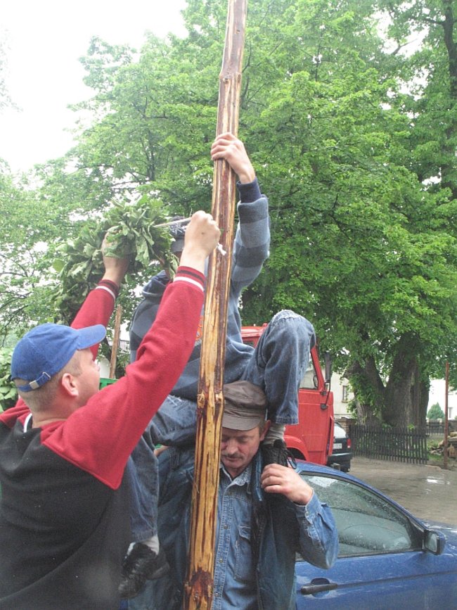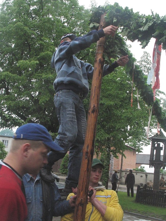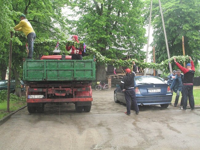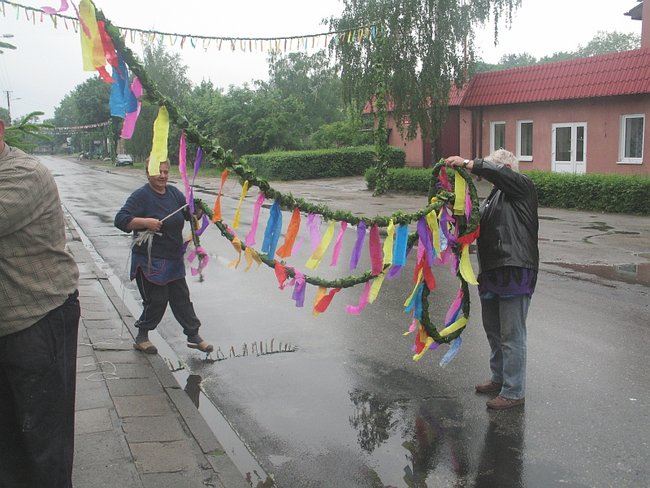O godzinie 18.32 pod kościół podjeżdża ciężarówka z Boguszyna. Siedmiu mężczyzn w wieku od 15 do 50 lat z przyczepy zeskakuje, brzózki zrzuca, za drągi się bierze. Kilkanaście metrów od furtki otaczającej kościelny dziedziniec do asfaltowej drogi w girlandy zdobią mieszkańcy Boguszyna właśnie. Tam też rodziny pletą girlandy, ale krótsze, bo tylko procesja, a nie ciężarówkia pod nimi przejść musi. Wszystkie tradycyjne - z dębowych gałązek. Razem szesnaście sztuk.