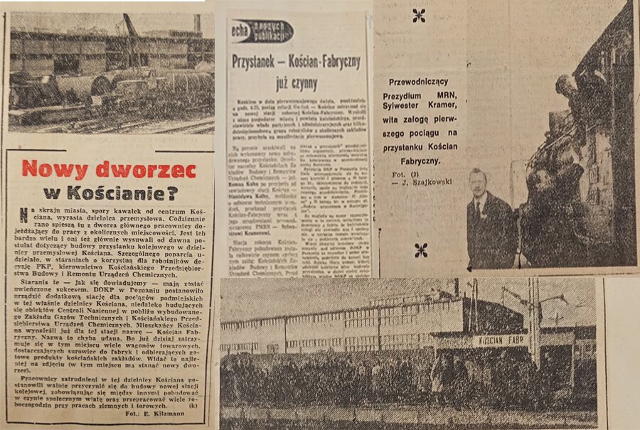 Starania te, jak się dowiadujemy mają zostać uwieńczone sukcesem. DOKP w Poznaniu postanowiło urządzić dodatkową stacje dla pociągów podmiejskich w tej właśnie dzielnicy Kościana, niedaleko budujących się obiektów Centrali Nasiennej w pobliżu wybudowanego Zakładu Gazów Technicznych i Kościańskiego Przedsiębiorstwa Urządzeń Chemicznych. Mieszkańcy Kościana wynaleźli już dla tej stacji nazwę - Kościan Fabryczny. Nazwa to chyba udana. Bo już dzisiaj zatrzymuje się w tym miejscu wiele wagonów towarowych dostarczających surowiec do fabryk i odbierających gotowe produkty kościańskich zakładów. Widać to najlepiej na zdjęciu (w tym miejscu ma stanąć nowy dworzec).