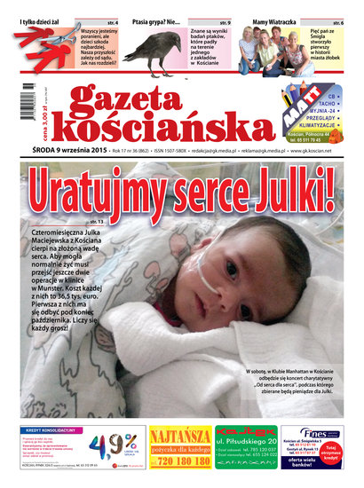 W numerze między innymi: o akcji zbierania pieniędzy dla chorej Julki, o tym że miłość czasem wygasa, o wynikach badań ptaków, które padły w Kościanie, o jedynym w powiecie żłobku, o kondycji kończącej dziesięć lat kościańskiej pływalni, o niczyim cmentarzu, o narodowym czytaniu „Lalki”, o wojennych dziejach honorowego obywatela Kościana. Ponadto: ilustrowany przegląd wydarzeń tygodnia z wszystkich gmin powiatu kościańskiego, kronika policyjna, informator kulturalny i serwis sportowy. Gazeta w sprzedaży od 9 września.