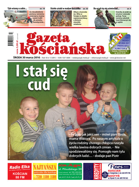 W numerze między innymi: o lawinie dobrych zmian w życiu rodziny chorego Wiktora, o nieratowaniu potrąconych zwierząt, o sokolniku tłumaczącym się przed sądem z depresji orła, o nowych przepisach dotykających złomiarzy, o podwyżce opłat za odbiór ścieków w Czempiniu i obniżce cen w Śmiglu, o cennym zabytku w małym kościółku, o lądowisku na dachu szpitala, o organizacji ruchu w Śmiglu. Ponadto: ilustrowany przegląd wydarzeń tygodnia z wszystkich gmin powiatu kościańskiego, kronika policyjna, informator kulturalny i obszerny serwis sportowy. Gazeta w sprzedaży od 30 marca.