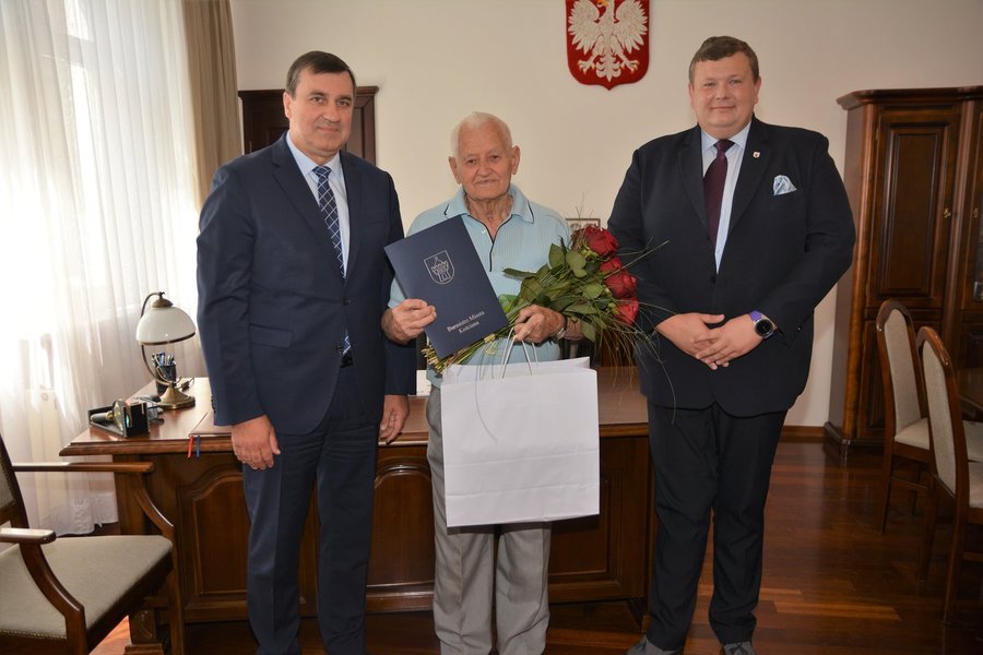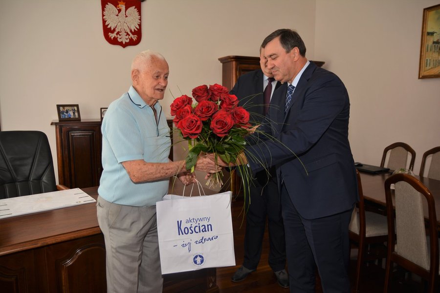Burmistrz Piotr Ruszkiewicz i przewodniczący miejskiej rady Dawid Olejniczak spotkali się ze świętującym 90-te urodziny Bogusławem Kaźmierczakiem. Samorządowcy podziękowali jubilatowi za wieloletnie zaangażowanie w rozwój sportu i wychowanie młodzieży.