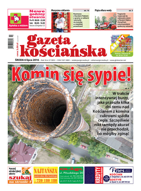 W numerze między innymi: o kominie cukrowni, z którego spadają cegły, o piątej ofierze wody w tym roku, o proteście mieszkańców Kiełczewa i Bonikowa, o kolejnych zmianach w kierownictwie Danko, o wielkiej fermie indyków budzącej obawy mieszkańców, o uchyleniu decyzji zwieszającej dyrektora szkoły w Głuchowie, o muzycznej szklarni w Kościanie, o emocjach wokół jarogniewickiego DPS, o nowym komendancie policji. Ponadto: ilustrowany przegląd wydarzeń tygodnia z wszystkich gmin powiatu kościańskiego, kronika policyjna, informator kulturalny i obszerny serwis sportowy. Gazeta w sprzedaży od 6 lipca