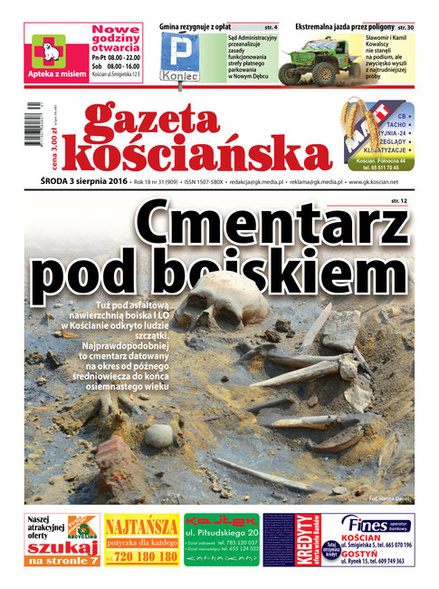 W numerze między innymi: o odkryciu cmentarza pod płytą boiska kościańskiego liceum oraz historia tego miejsca spisana piórem Jerzego Zielonki, o zawieszeniu opłat za parkowanie w Nowym Dębcu, o wypadkach i kolizjach na drogach powiatu, o ekstremalnym rajdzie samochodowym, o utytułowanej zawodniczce kościańskiego klubu karate, o wielomilionowej dotacji dla miejskich wodociągów. Ponadto: ilustrowany przegląd wydarzeń tygodnia z wszystkich gmin powiatu kościańskiego, kronika policyjna, informator kulturalny i obszerny serwis sportowy. Gazeta w sprzedaży od 3 sierpnia