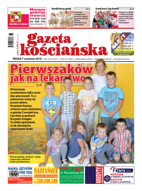 Ponadto: ilustrowany przegląd wydarzeń tygodnia z wszystkich gmin powiatu kościańskiego, kronika policyjna, informator kulturalny i obszerny serwis sportowy. Gazeta w sprzedaży od 7 września 2016 r.
