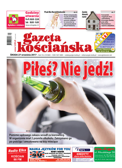 W numerze między innymi: o karach dla pijanych kierowców, o płycie Maryli Rodowicz z muzyką i tekstami Witka Łukaszewskiego, o debacie na temat kościańskiego ośrodka rehabilitacji, o pracującym w Szczodrowie Francuzie, o krzywińskich piernikach i miodzie, o dudziarskim turnieju, o kolejnej próbie ratowania krzywego domku w Kościanie, o strażackim jubileuszu, o remoncie linii kolejowej. Ponadto: ilustrowany przegląd wydarzeń tygodnia z wszystkich gmin powiatu kościańskiego, kronika policyjna, informator kulturalny i obszerny serwis sportowy. Gazeta w sprzedaży od 27 września