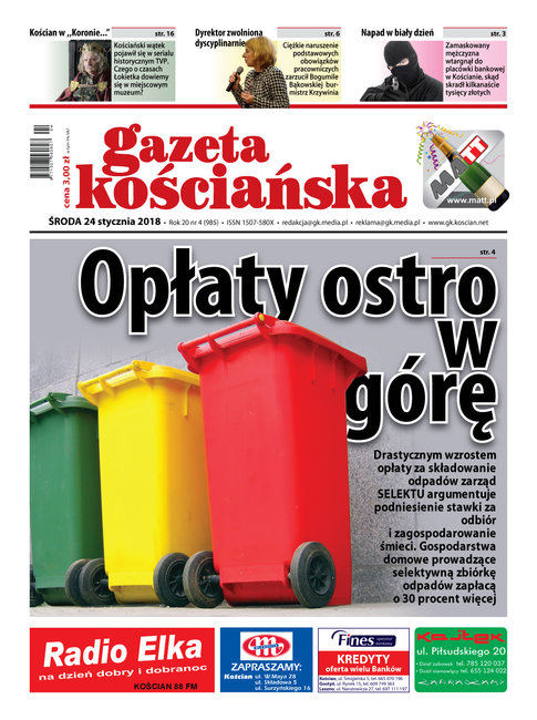 W numerze między innymi: o drastycznej podwyżce opłat za wywóz śmieci, o napadzie na filię bankową w Kościanie, o dyscyplinarnym zwolnieniu szefowej gminnej biblioteki w Krzywiniu, o pierwszej ofierze tegorocznej zimy, o przejściu podziemnym w Czempiniu, rozmowa o historii i przyszłości projektu „Gramy w szklarni”, kościańskim wątku w historycznej telenoweli TVP, o walce ze smogiem, o kolejnej akcji rejestrowania potencjalnych dawców szpiku. Ponadto: ilustrowany przegląd wydarzeń tygodnia z wszystkich gmin powiatu kościańskiego, kronika policyjna, informator kulturalny i obszerny serwis sportowy. Gazeta w sprzedaży od 24stycznia