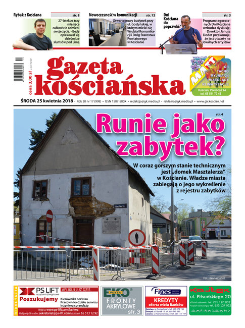 W numerze między innymi: o tym czy „domek Masztalerza” rozsypie się, czy zostanie rozebrany, o zasadach dobierania wykonawców na dni miasta, o rowerzystach unikających ścieżek rowerowych, o 27-latku z Kościana wyruszającym na roczną świecką misję do Peru, o nowej siedzibie „komunikacji”, o inwestycjach drogowych. Ponadto: ilustrowany przegląd wydarzeń tygodnia z wszystkich gmin powiatu kościańskiego, kronika policyjna, informator kulturalny i obszerny serwis sportowy. Gazeta w sprzedaży od 25 kwietnia