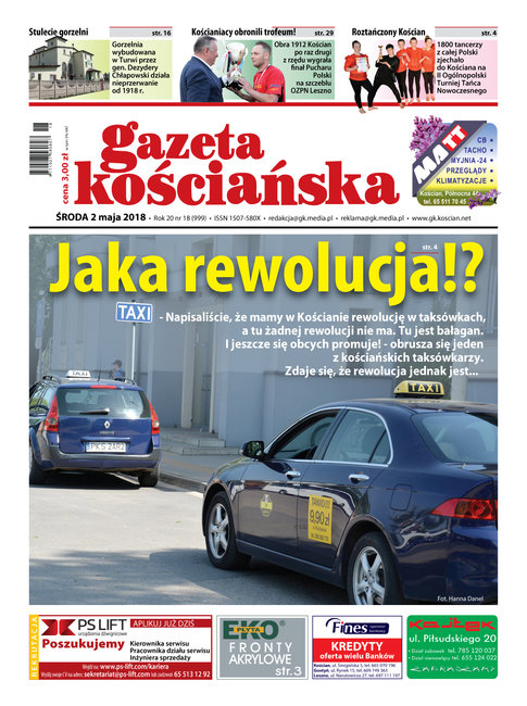 W numerze między innymi: raz jeszcze o kościańskich taksówkach, o wielkim turnieju tańca, o stuleciu gorzelni w Turwi, o gotowaniu pod okiem jury, o pudełku życia, o sztandarze dla strażaków z Rąbinia, o kosztach kolejnego etapu budowy traktu rekreacyjnego, o tygodniu bibliotek, o uniwersytecie dla seniorów. Ponadto: ilustrowany przegląd wydarzeń tygodnia z wszystkich gmin powiatu kościańskiego, kronika policyjna, informator kulturalny i obszerny serwis sportowy. Gazeta w sprzedaży od 2 maja