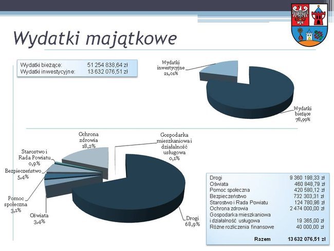 Na inwestycje powiat wydał 13 632 076,51 zł, co stanowiło 21% kwoty wydatków ogółem. Pieniądze te przeznaczono na inwestycje drogowe (68,9%), ochronę zdrowia (18,2%), bezpieczeństwo (5,4%), oświatę (3,4%) oraz pomoc społeczną (3,1%).