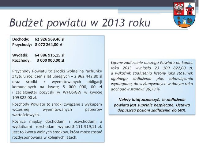 Dochody powiatu wyniosły w 2013 roku 62 926 569,46 złotych. 59% dochodów stanowiły subwencje oraz dotacje z budżetu państwa. Dochody własne stanowiły natomiast 32%, a środki unijne 3% wszystkich dochodów. Wydatki bieżące i inwestycyjne zamknięto w kwocie 64 886 915,15 zł.