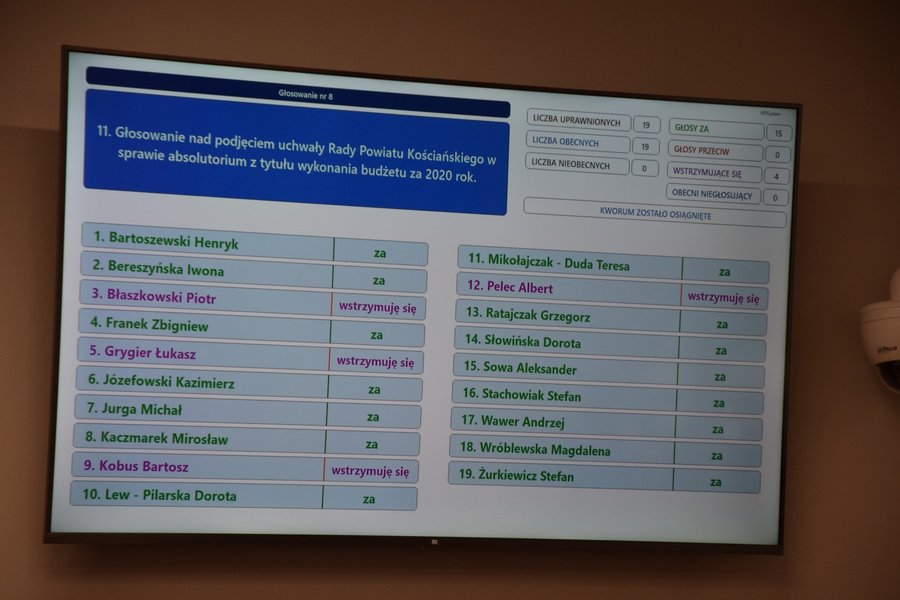 Podczas XXXI sesji Rady Powiatu Kościańskiego, która odbyła się wyremontowanej sali posiedzeń, radni udzielili Zarządowi Powiatu Kościańskiego absolutorium za wykonanie budżetu w roku 2020.