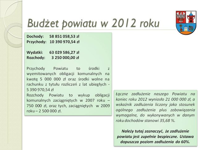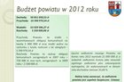 Przed głosowaniem starosta Andrzej Jęcz przedstawił informację na temat wykonania ubiegłorocznego budżetu powiatu. Dochody zamknęły się w kwocie 58 851 058,53 złotych, przy czym plan na dzień 1 stycznia 2012 roku zakładał dochody w wysokości 55 777 247 złotych. W strukturze budżetu 59% dochodów stanowiły subwencje oraz dotacje z budżetu państwa. Dochody własne stanowiły 35%, a środki unijne 4% wszystkich dochodów.