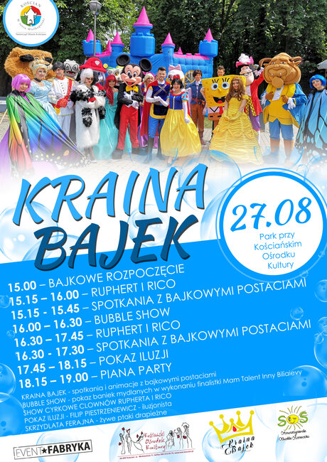 Samorząd Kościana zaprasza w sobotę, 27 sierpnia, na spotkanie z bohaterami znanych i lubianych opowieści. W tym roku dodatkową atrakcją „Krainy Bajek” będzie pokaz baniek mydlanych w wykonaniu finalistki Mam Talent Inny Biliaievy. W świat magii wprowadzi iluzjonista Filip Piestrzeniewicz.