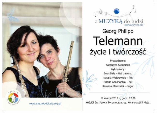 Stowarzyszenie z Muzyką do Ludzi zaprasza w niedzielę, 17 marca 2013 r., na koncert muzyki barokowej, który odbędzie się w kaplicy parafii pw. św. Karola Boromeusza w Kościanie.