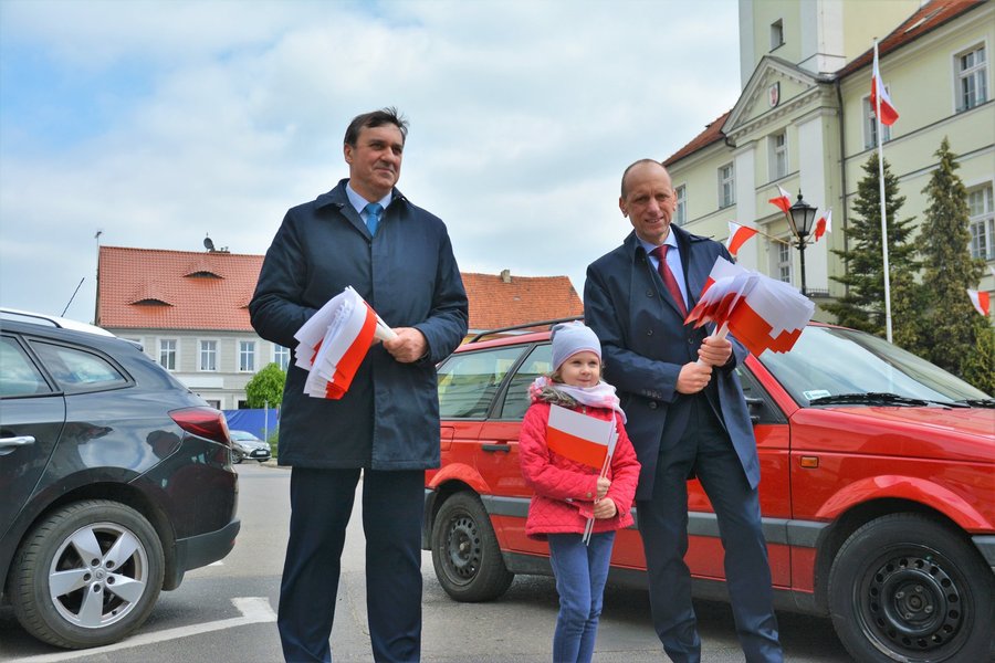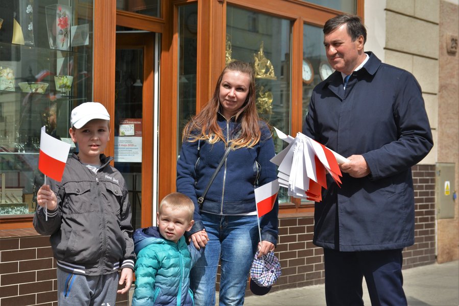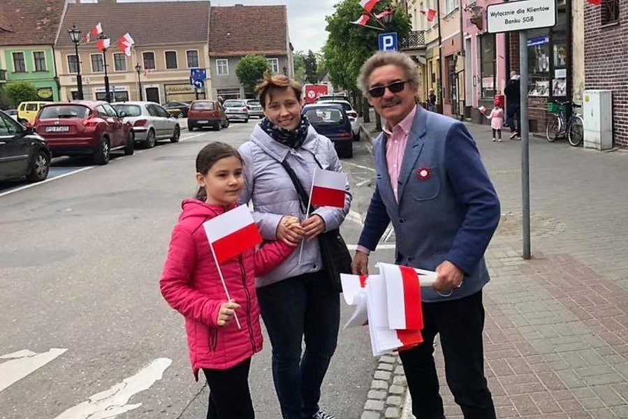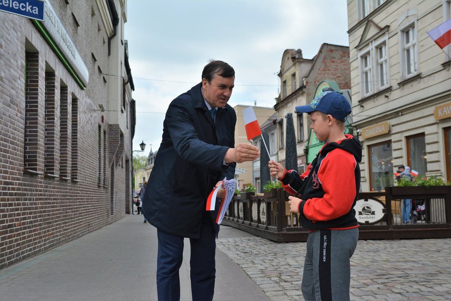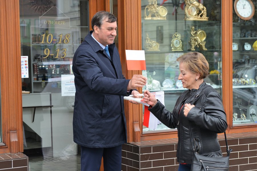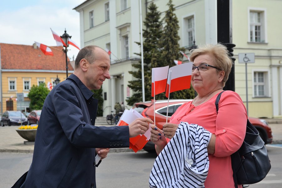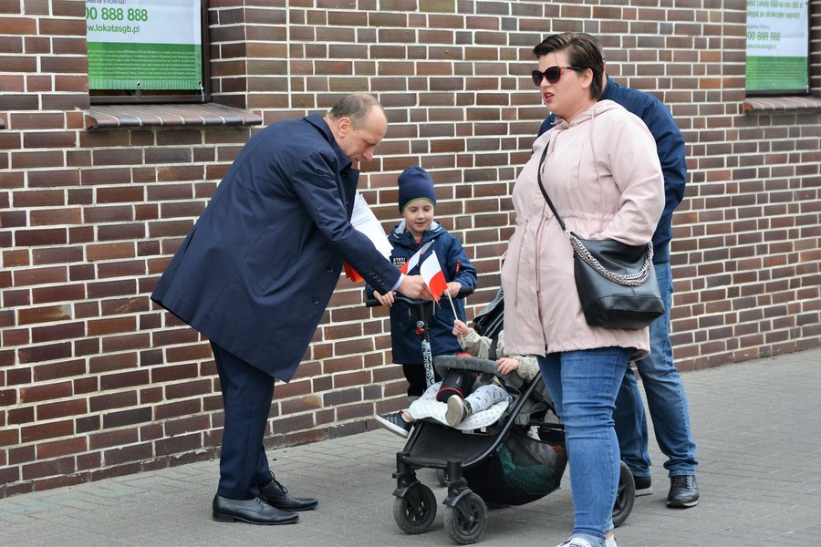Chorągiewki w barwach narodowych wręczali mieszkańcom poseł Wojciech Ziemniak, burmistrz Piotr Ruszkiewicz i przewodniczący miejskiej rady Maciej Zielonka.