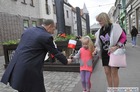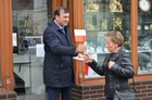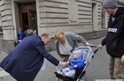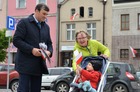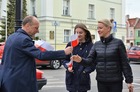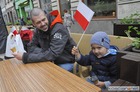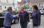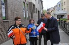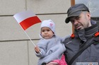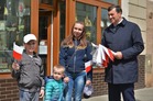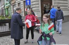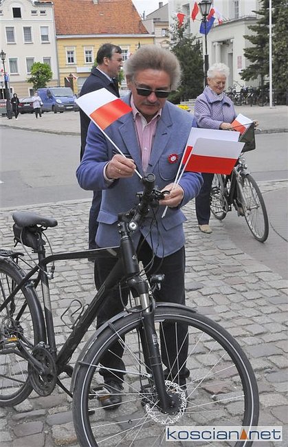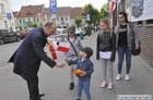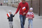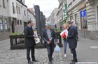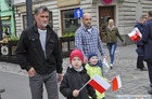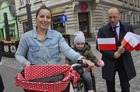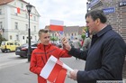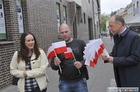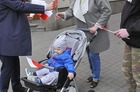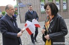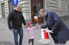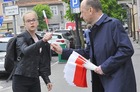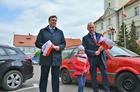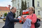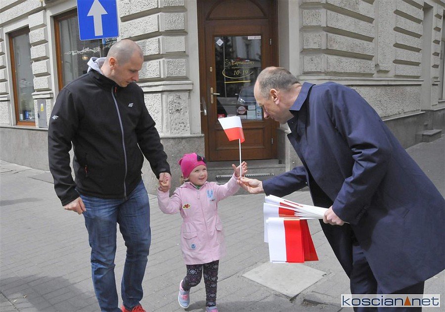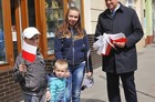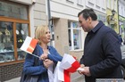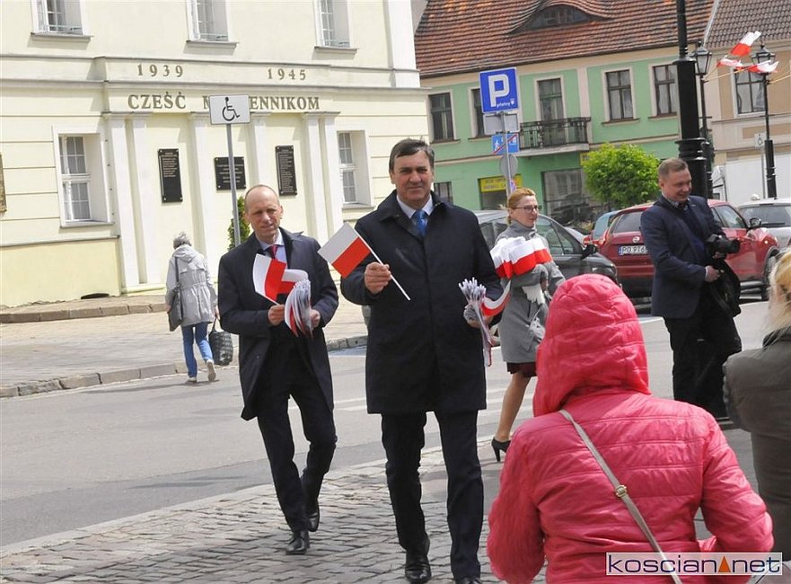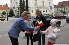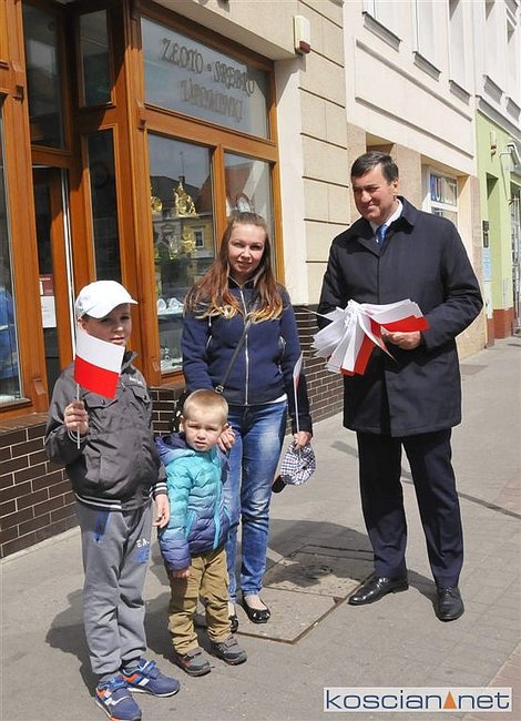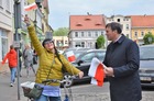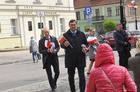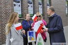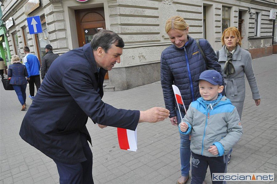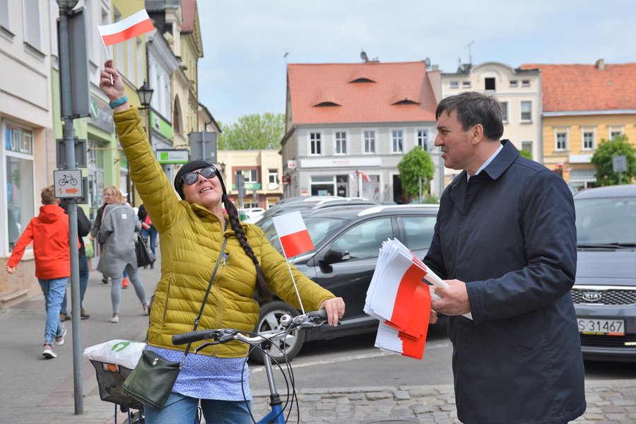Chorągiewki w barwach narodowych wręczali mieszkańcom poseł Wojciech Ziemniak, burmistrz Piotr Ruszkiewicz i przewodniczący miejskiej rady Maciej Zielonka.