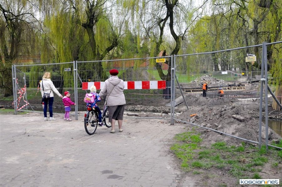 Stare mostki rozebrano 8 marca (zdjęcia). Pozostałości jednego z nich są dziś przerzucone przez kanał jako kładka techniczna wykorzystywana przez pracujących na budowie. Zgodnie z umową nowa przeprawa przez kanały ma powstać w ciągu dwudziestu tygodni.