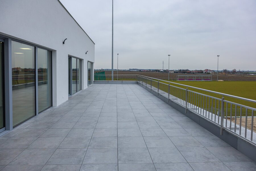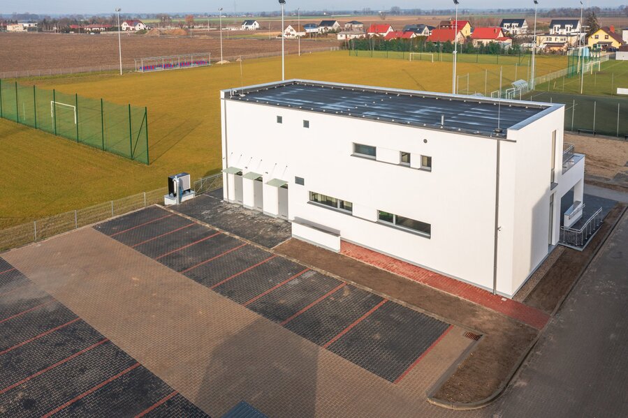 Przy boiskach powstał budynek o powierzchni użytkowej 354,5 m2, w którym znajdują się szatnie dla zawodników i sędziów, pomieszczenie klubowe, magazyn sprzętu sportowego, kotłownia i pomieszczenie techniczne.