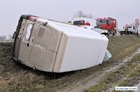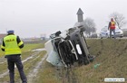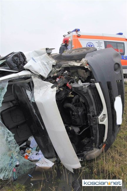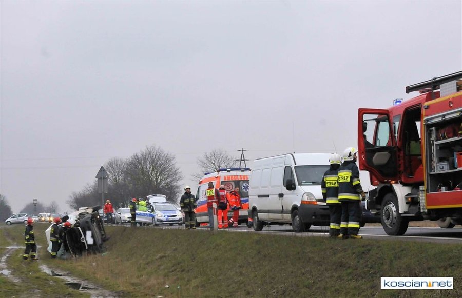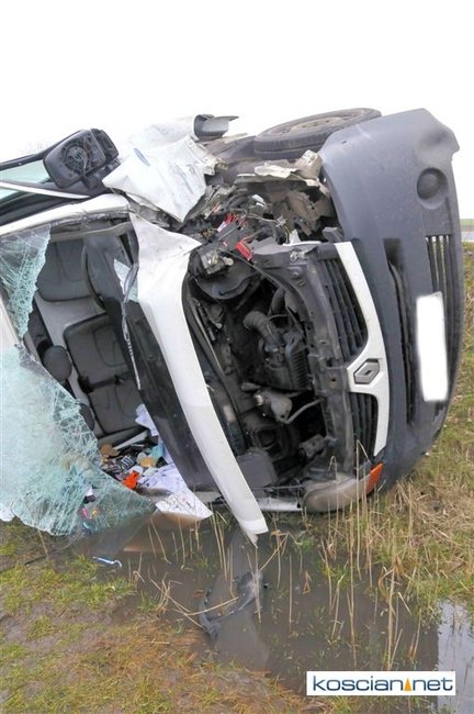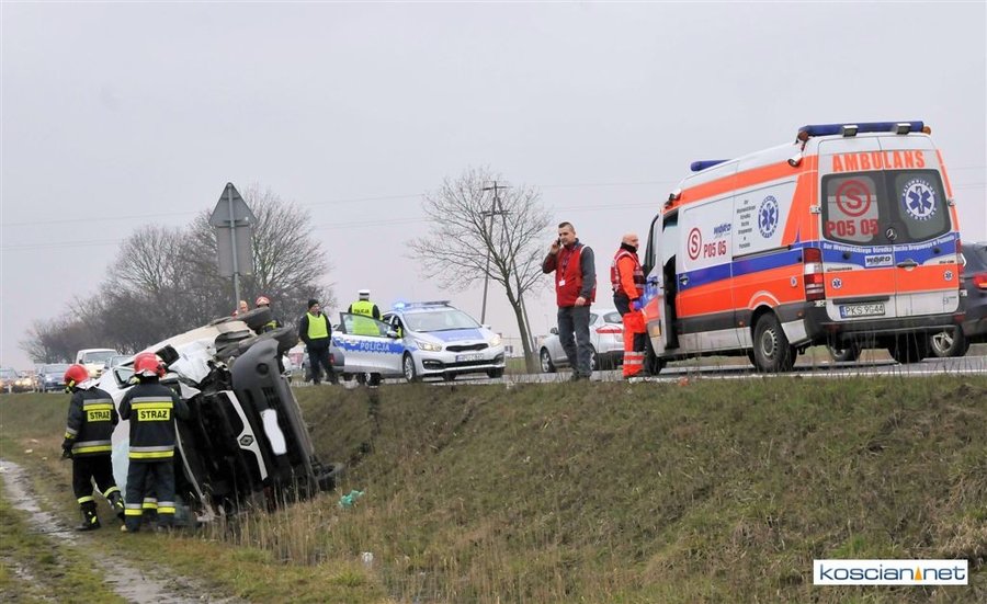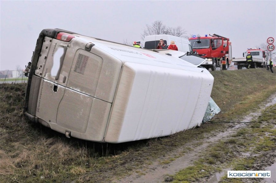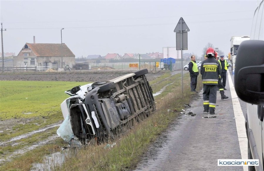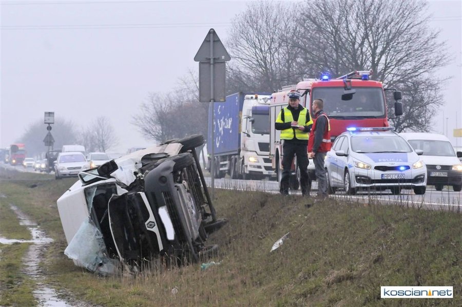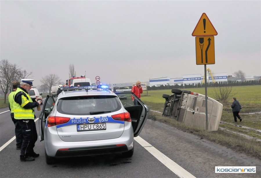 Jadący w kierunku Poznania bus renault uderzył w poprzedzające go dostawcze iveco po czym zjechał z drogi i przewrócił się. Nikt z uczestników kolizji nie odniósł obrażeń. Policja ustala okoliczności zdarzenia.