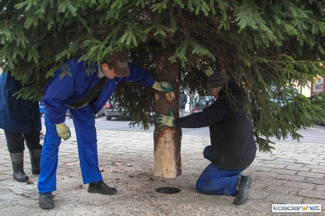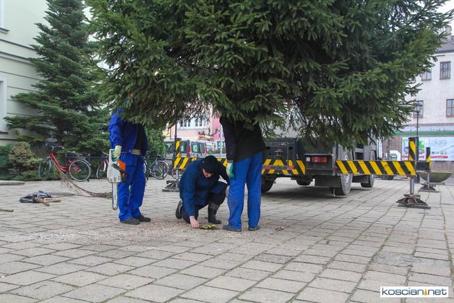 Na Rynek choinka przyjechała w piątek, 5 grudnia, około godziny 10. Do pionu postawił ją dźwig firmy EWMAR, która od trzech lat bezpłatnie pomaga przy ustawianiu świątecznego drzewka. Pień fachowo przycięła i choinkę osadziła ekipa z Miejskiego Zakładu Gospodarki Mieszkaniowej i Dróg.