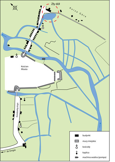 „Zły dół” to oczywiście nazwa potoczna. W rzeczywistości obejmuje ona spory fragment terenu dawnej Kurzejgóry, a więc część dawnych dóbr każdorazowego starosty kościańskiego. Kluczem do ostatecznego wyjaśnienia, co znajdowało się w obrębie „Złego dołu”, staje się plan miasta Kościana z 1803 roku, zachowany dzięki odpisom wybitnego krakowskiego archiwisty, żołnierza wyklętego Henryka Müncha. Otóż na przełomie XVIII i XIX wieku na „Złym dole” znajdowały się niewątpliwie karczma zwana starościńską ze stajnią dla koni, staw, połączony z rozlewiskami rzeki i kuźnia. Cały ten układ przestrzenny, łącznie z przebiegiem bardzo kapryśnej Obry, zmienił się w połowie XIX wieku po przeprowadzeniu melioracji tzw. Łęgów Obrzańskich.