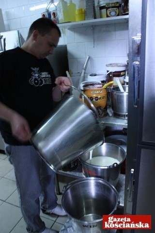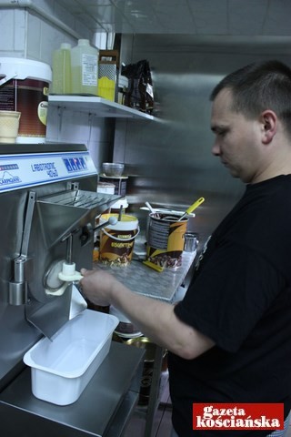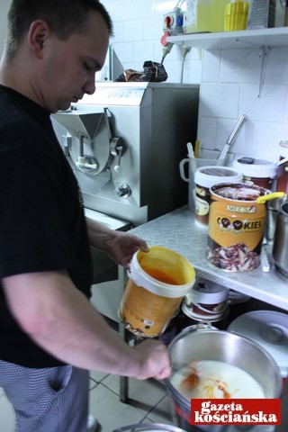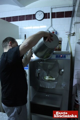 Po ósmej do kotła trafia pierwsze 90 litrów mleka. Miesza się je z cukrem, śmietanką kremówką (- Dlatego takie pyszne – uśmiecha się), odrobiną zagęstnika i mlekiem w proszku. To baza dla większości smaków. Całość podgrzewa się do wspomnianej już temperatury 70 stopni Celsjusza i wiaderkiem przelewa do sąsiedniego kotła, który ją chłodzi. Zaraz też pierwszy kocioł zalewany jest kolejną 90 litrową partią mleka i dodatków. Około dziesiątej można kręcić pierwsze partie lodów. Jest 10.15. Zimną bazę pan Remigiusz zlewa do wiaderka i stawia na stołku obok maszyny.