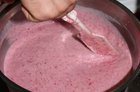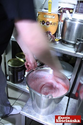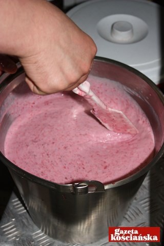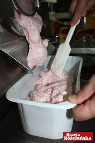 Potem ,,robią się'' truskawkowe. Te, podobnie jak wiśniowe, miesza się ze świeżych owoców. Pół na pół z mleczną bazą. Remigiusz Paul wielkim mieszadłem rozdrabnia truskawki, do wiaderka leje zimną bazę, dolewa chochlą owoce, miesza, wlewa całość do maszyny i trzy i pół minuty później mamy sześć litrów truskawkowej pyszności. Tego dnia w Wytwórni Lodów WM powstać miały jeszcze lody: śmietankowe, wiśniowe, czekoladowe, pistacjowe, cherry mania i kilka mniej popularnych smaków. Wszystkie trafiły do zamrażarek. Do lodziarni trafią jutro, lub pojutrze.