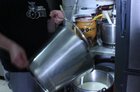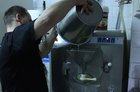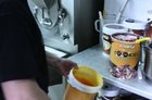 A więc ciasteczkowe – decyduję, a pan Remigiusz zaczyna zwinne wywijać chochelką. Do bazy leje się smak. To gotowa esencja. Z jej pomocą miesza się większość smaków. Energiczne mieszanie, a potem ciecz leje się z wiadra do maszyny. Tam ustawia się stopień zmrożenia lodów, dusi przycisk na start i...