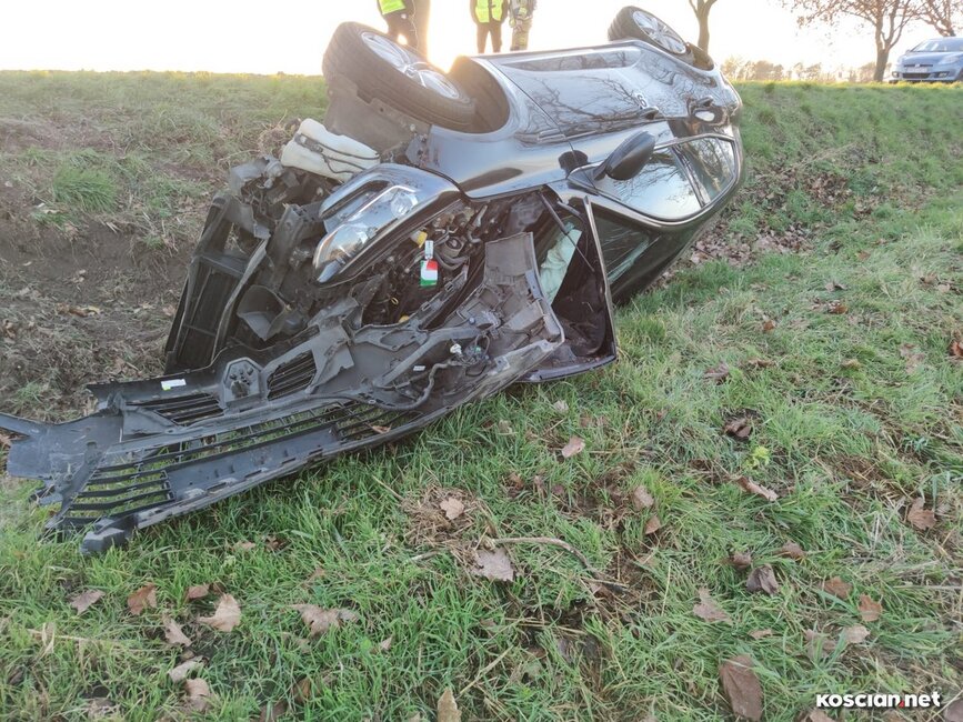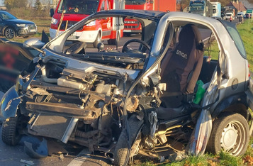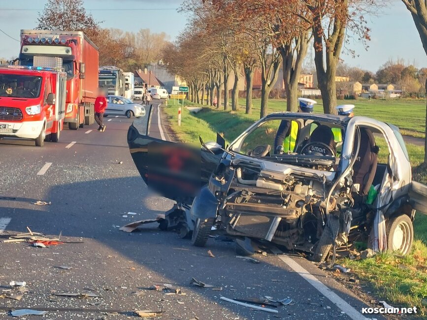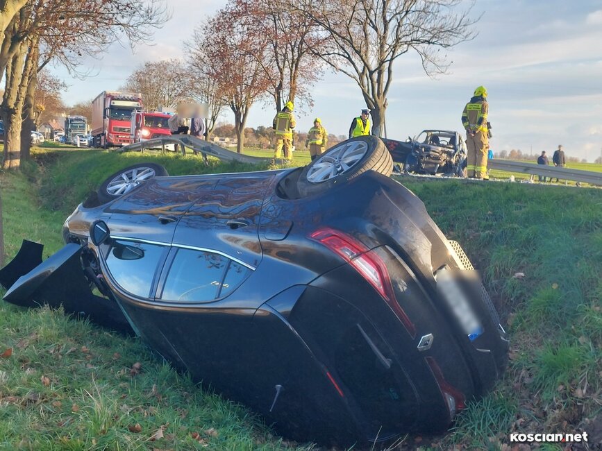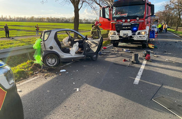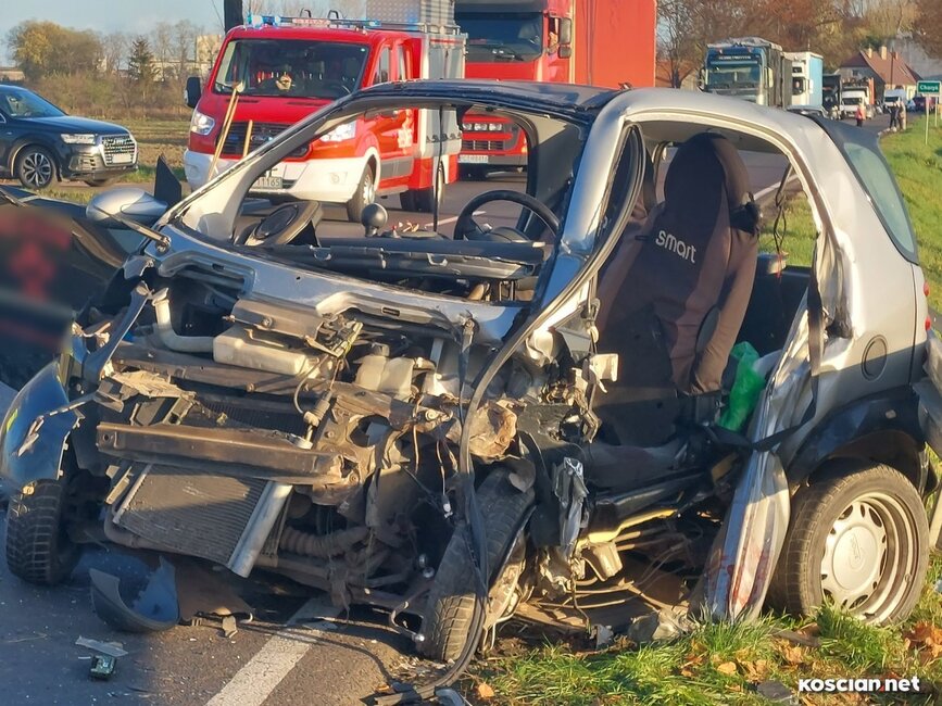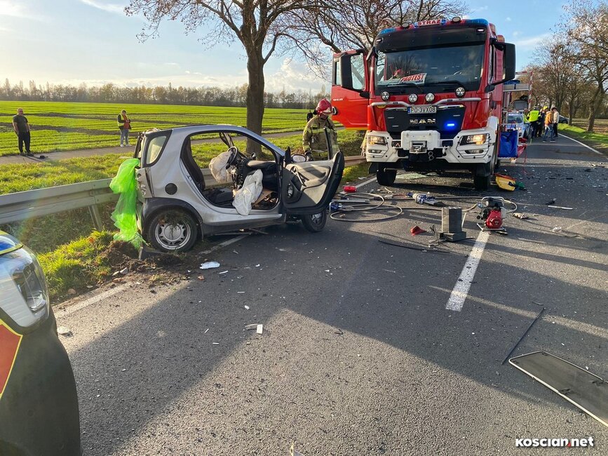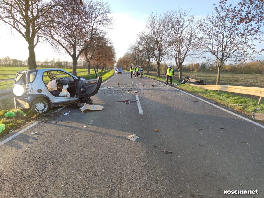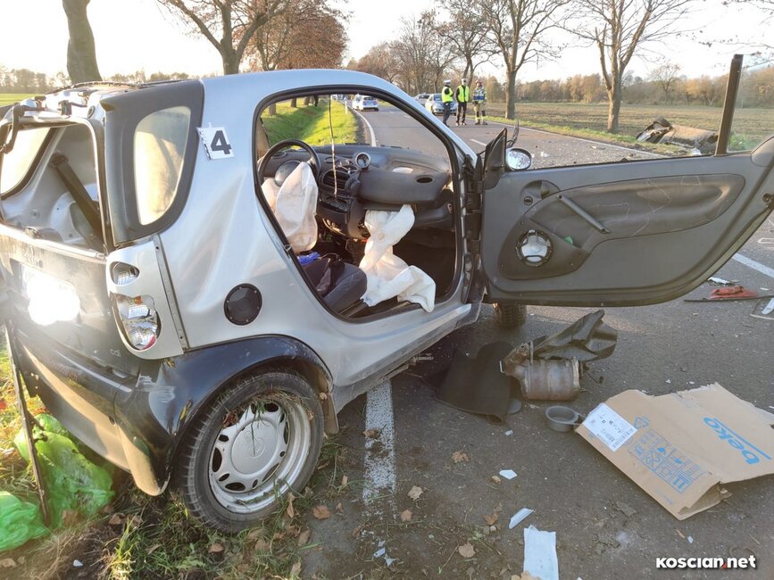 Do wypadku doszło w czwartek, 10 listopada, około godziny 14. Renaultem kierowała 23-letnia mieszkanka gminy Krzywiń, a smarta prowadził 19-latek z gminy Śmigiel. Po czołowym zderzeniu renault dachował w przydrożnym rowie, a kierowca smarta został zakleszczony w aucie. Do szpitala przetransportowano kierowców obu aut.