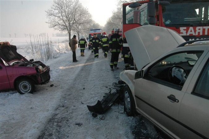 Dziś przed południem na drodze Karśnice – Nadolnik (gmina Śmigiel) doszło do czołowego zderzenia fiata seicento z volkswagenem golfem. Rannych kierowców obu samochodów odwieziono do szpitala.