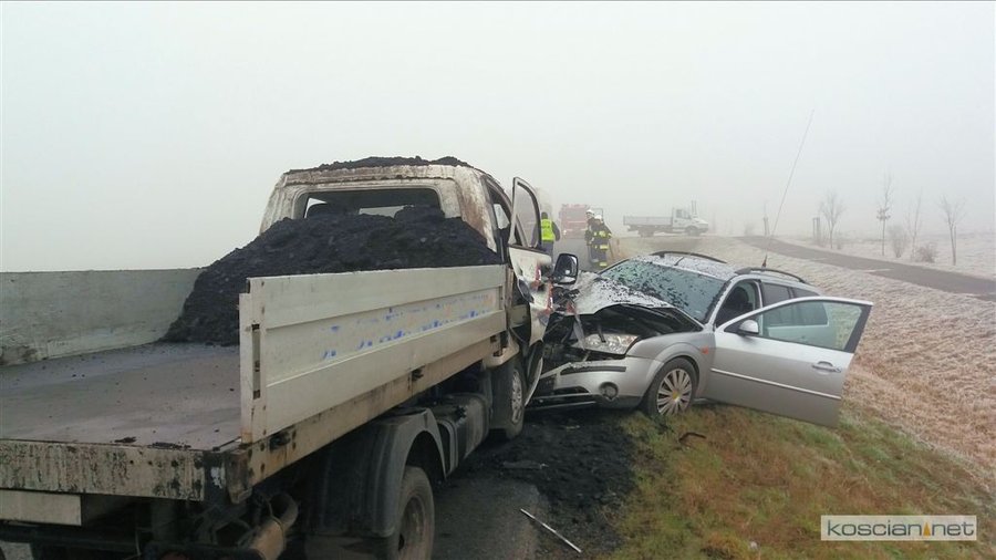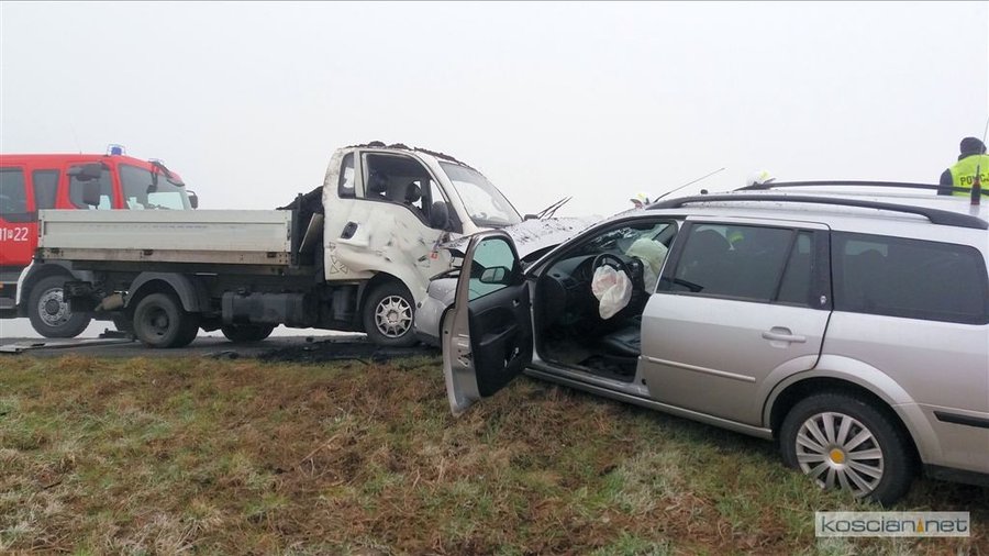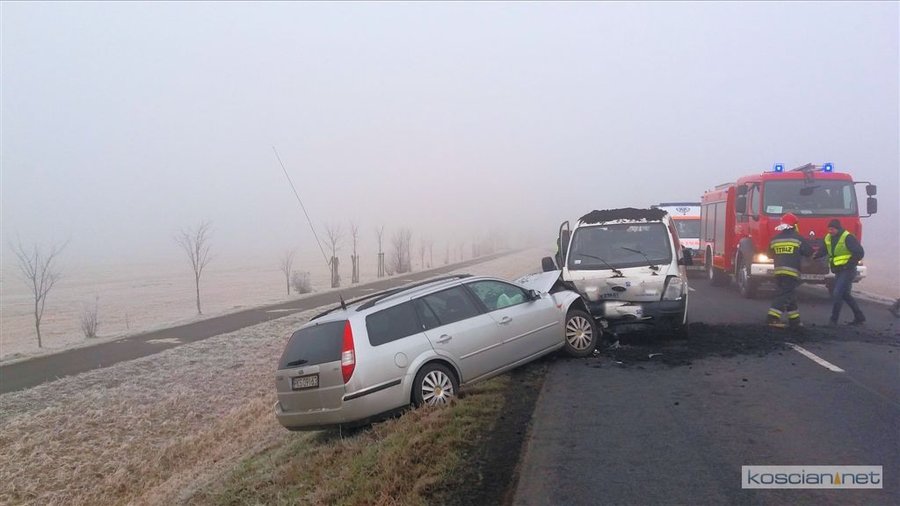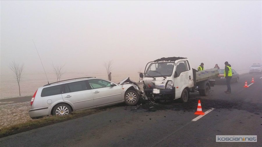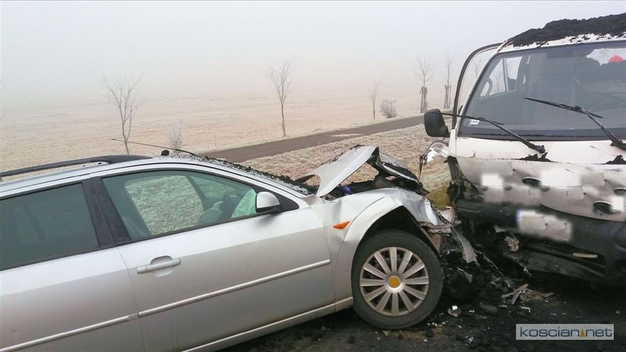 Na drodze Kościan – Racot czołowo zderzyły się osobowy ford i dostawcza kia. Kierowcy osobówki zatrzymano prawo jazdy.