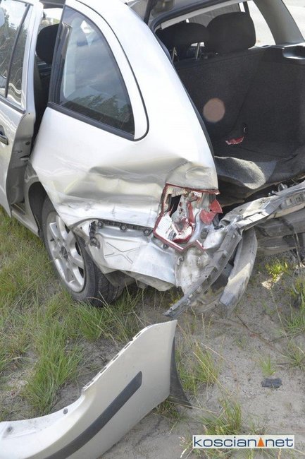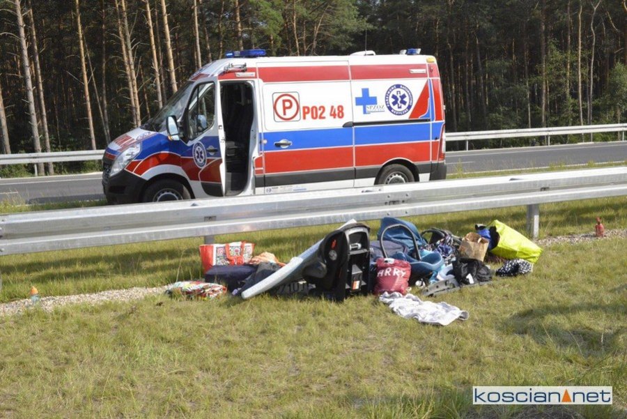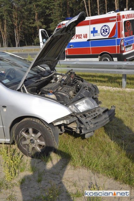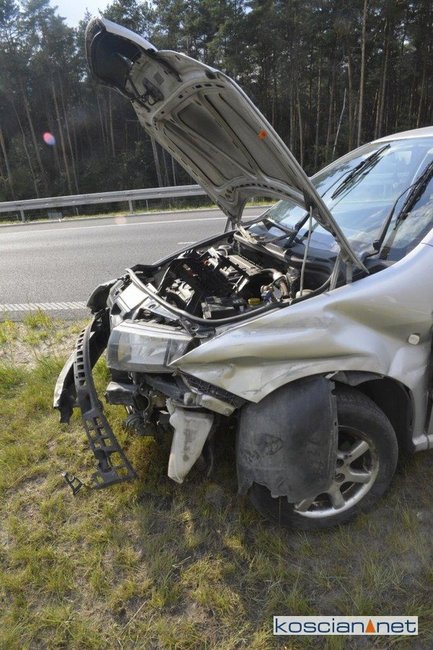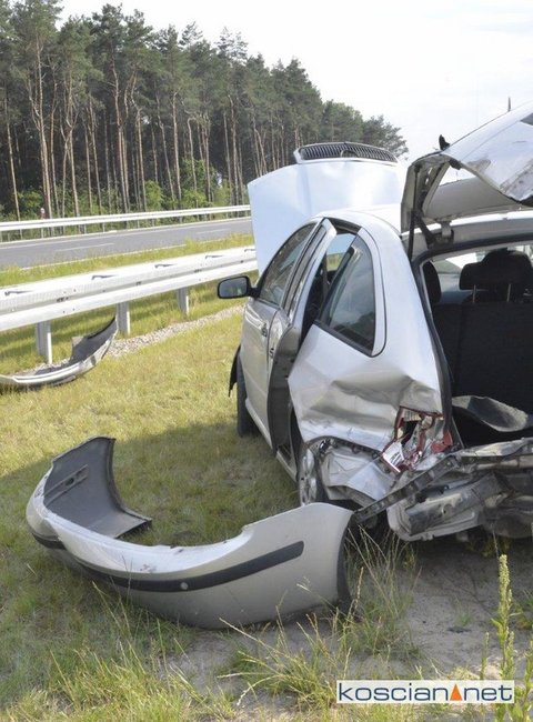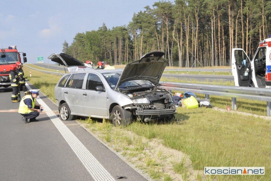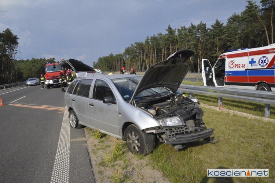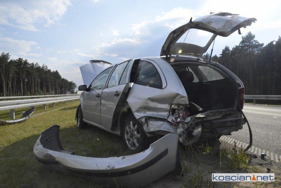 Do zdarzenia doszło w sobotę, 18 lipca, około godziny 17. w pobliżu węzła Kościan Północ drogi ekspresowej nr 5. Kierowca skody jadący w kierunku Wrocławia stracił panowanie nad pojazdem po pęknięciu tylnej opony. Auto uderzyło w bariery oddzielające pasy ruchu. Cztery osoby podróżujące skodą przewieziono do szpitala na badania.