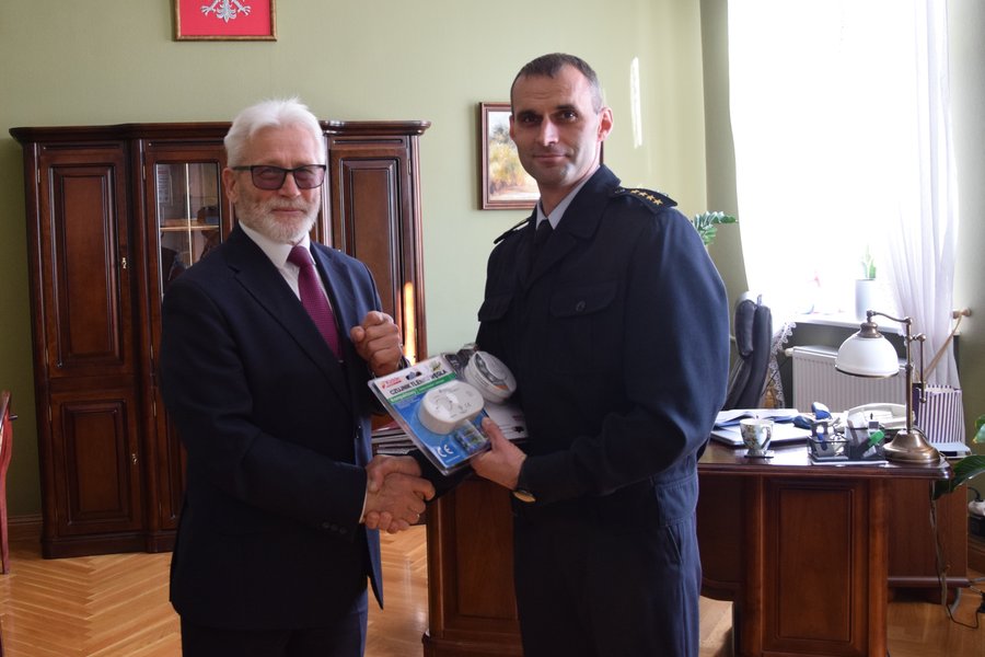 Starosta Kościański Henryk Bartoszewski przekazał dzisiaj 17 detektorów tlenku węgla i 12 czujników dymu Komendantowi Powiatowemu Państwowej Straży Pożarnej w Kościanie Szymonowi Klemenskiemu. Koszt przekazanych urządzeń to blisko 2 tys. złotych. Strażacy będą rozdawać czujki podczas akcji profilaktycznych i edukacyjnych.