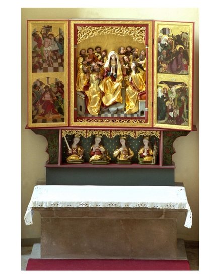 Ołtarz ten według kościańskiej tradycji nosił też nazwę „Wszystkich Świętych” oraz „Zaśnięcia Najświętszej Marii Panny”. Do początku XX wieku przebywał w obecnej kaplicy p.w. św. Benona, obecnie znajduje się przy ambonie. Pierwotnie był to poliptyk, lecz do naszych czasów zachował się jako tryptyk. W środkowej części umieszczona jest postać Marii, o nieco orientalnych rysach twarzy, w otoczeniu 12 apostołów. Na awersach zachowanych skrzydeł wyobrażone zostały sceny pasyjne, z drugiej strony – sceny z dzieciństwa Chrystusa.
