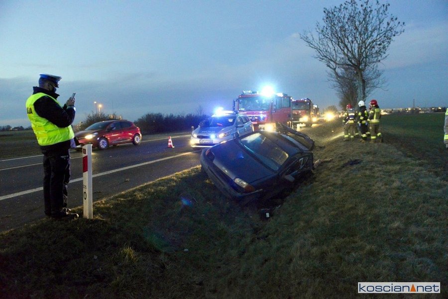 Do zdarzenia doszło w piątek, 12 marca, około godziny 18., na drodze wojewódzkiej 309 (dawna droga krajowa nr 5) pomiędzy Poninem a Kościanem. Jak wynika ze wstępnych ustaleń kierujący fiatem punto stracił panowanie nad pojazdem i zjechał z drogi. Auto dachowało i zakończyło jazdę w przydrożnym rowie. Kierowcę przewieziono do szpitala na badania.