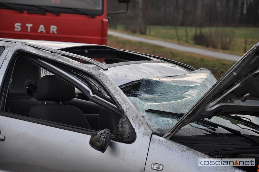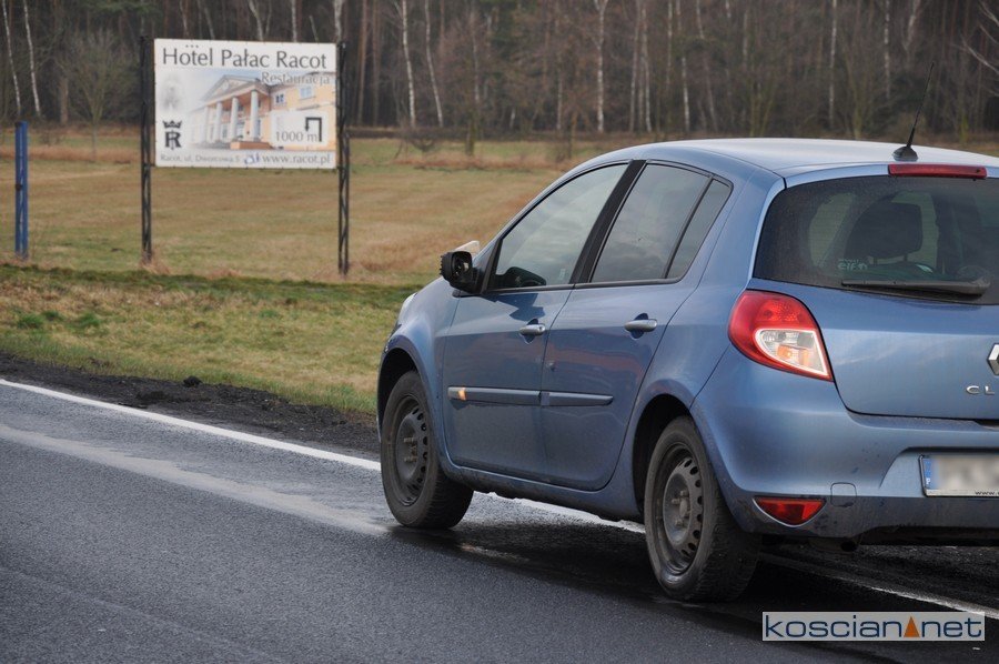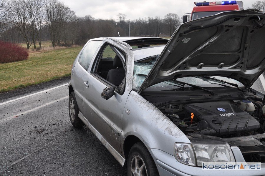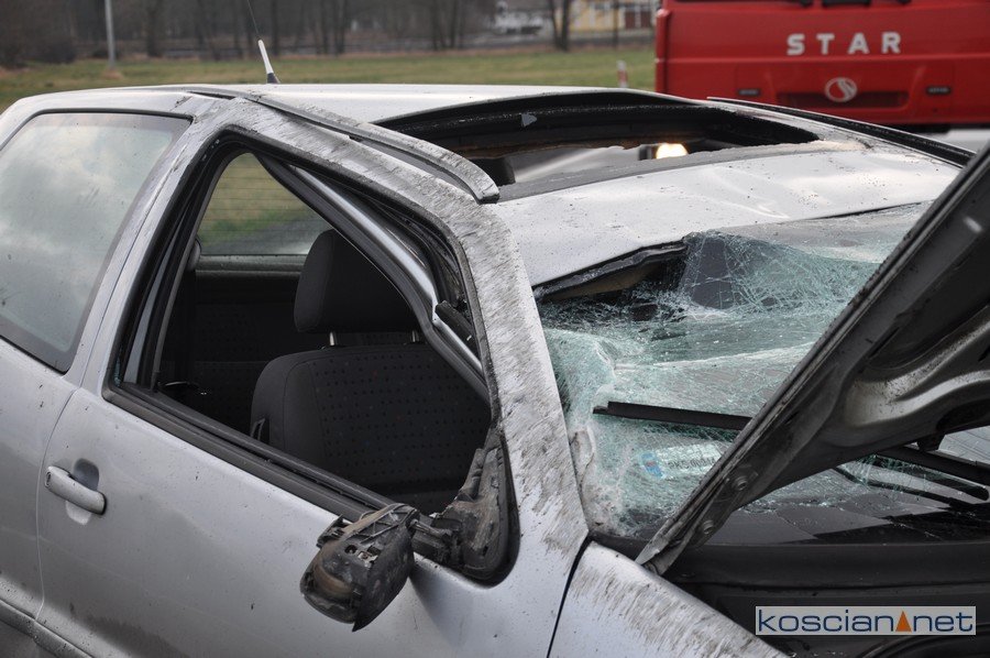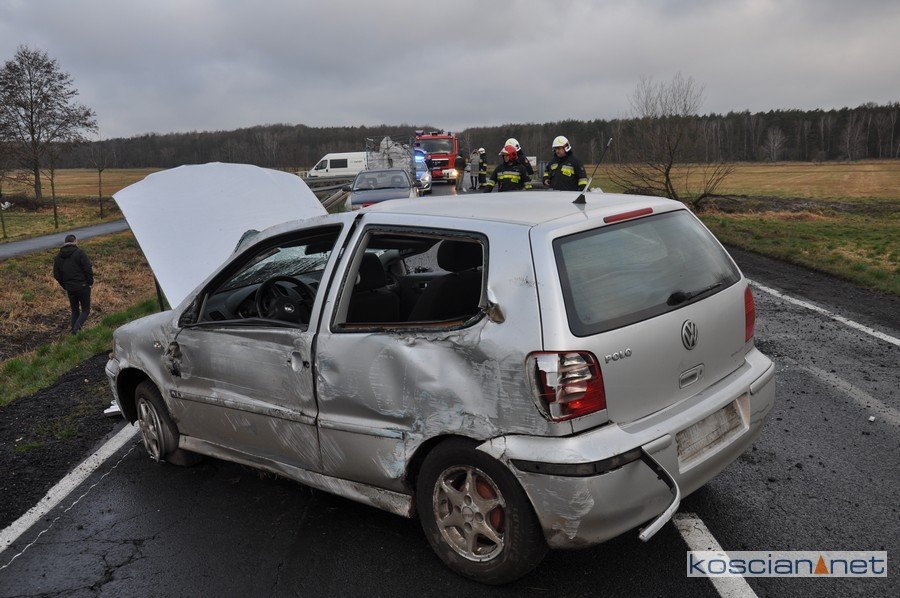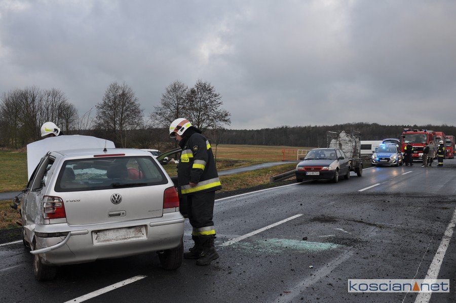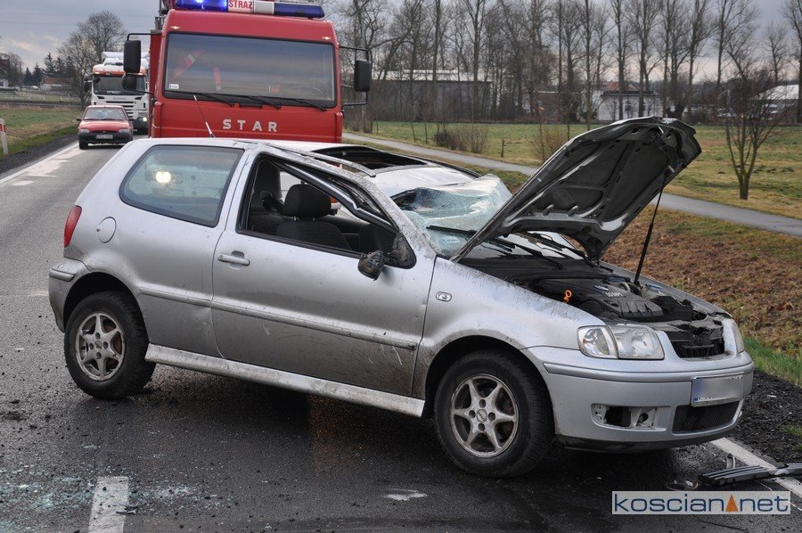 Do zdarzenia doszło w środę, 26 lutego, około godziny 8., na drodze wojewódzkiej nr 308, pomiędzy Kościanem a Racotem. Kierująca volkswagenem polo, 42-letnia mieszkanka powiatu kościańskiego, podczas manewru wyprzedzania zahaczyła o jadącego przed nią opla astrę, a następnie zmusiła do gwałtownego zjechania na pobocze jadące z przeciwnego kierunku renault clio i hondę civic. Sprawczyni kolizji straciła panowanie nad pojazdem, który zjechał z drogi i dachował. Kierującą volkswagenem przewieziono do szpitala na badania.
