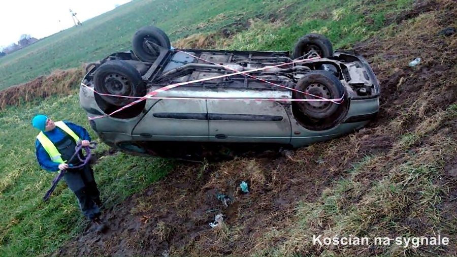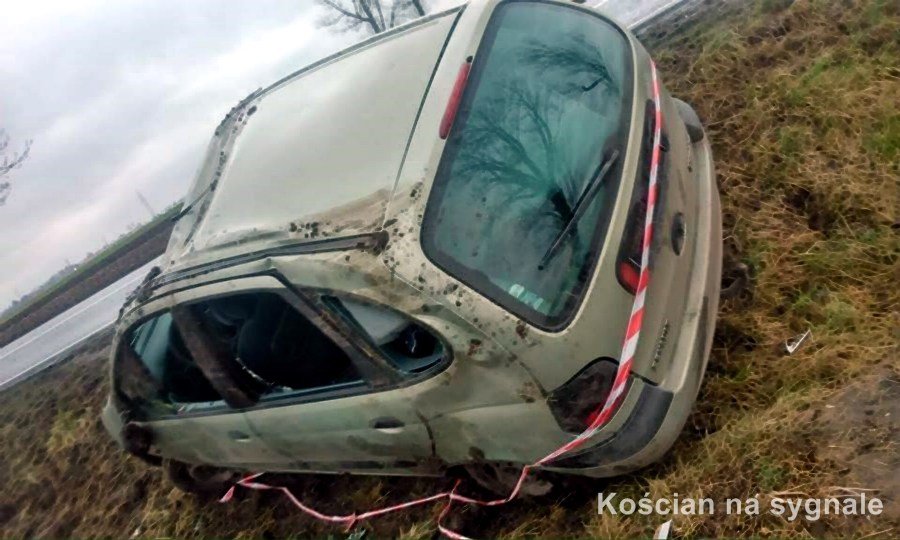 Do zdarzenia doszło na łuki drogi. Jak informuje serwis Kościan na sygnale kierujący renaultem, 27-letni mieszkaniec gminy Kościan, zjechał z drogi do rowu, gdzie auto dachowało. Kierowca i pasażer wyszli z kolizji bez szwanku.