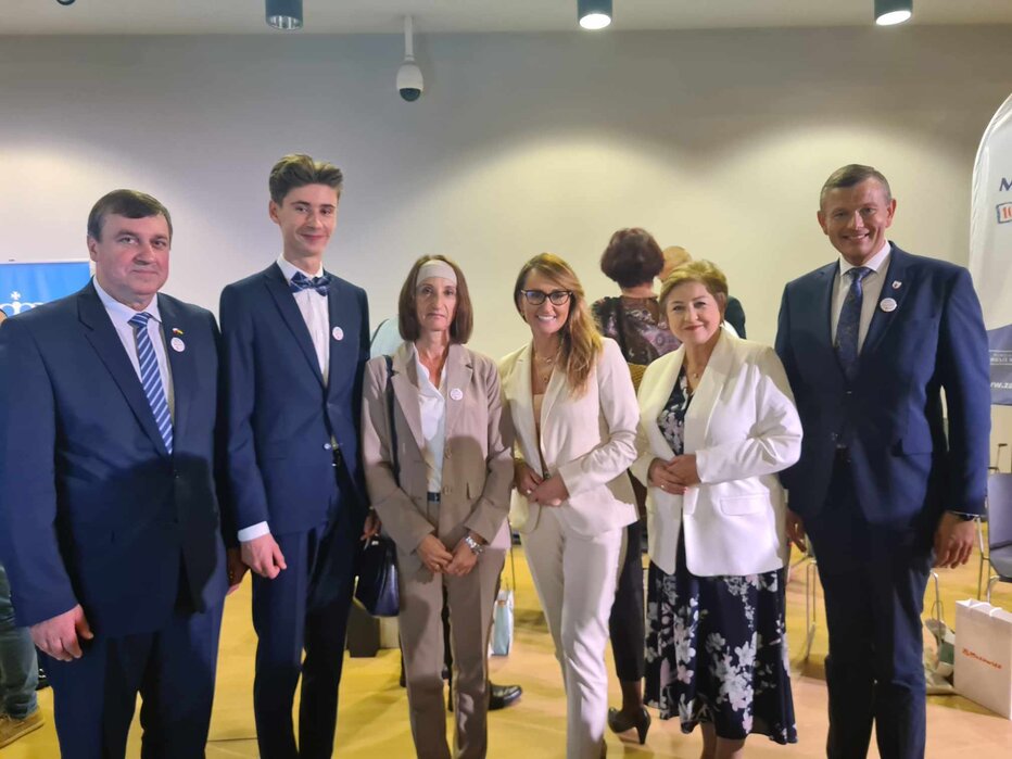 Na zdjęciu: Dawid Bugajewski z mamą i samorządowcami: wiceprezydent Warszawy, wicemarszałek województwa mazowieckiego, burmistrzem Kościana i Przewodniczącym Rady Miejskiej Kościana, podczas gali konkursu "Matura na 100 procent". Fot. AKN