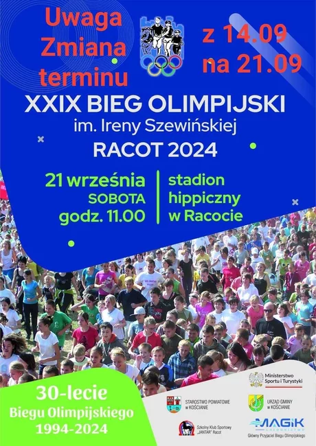 Organizatorzy XXIX Biegu Olimpijskiego – RACOT 2024 mając na względzie bezpieczeństwo uczestników podjęli decyzję o przełożeniu imprezy z soboty 14.09. na sobotę 21.09. Miejsce oraz godzina rozpoczęcia biegu oraz pozostałe zapisy regulaminu pozostają bez zmian.