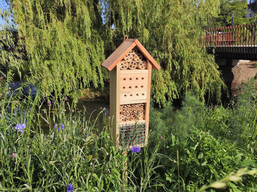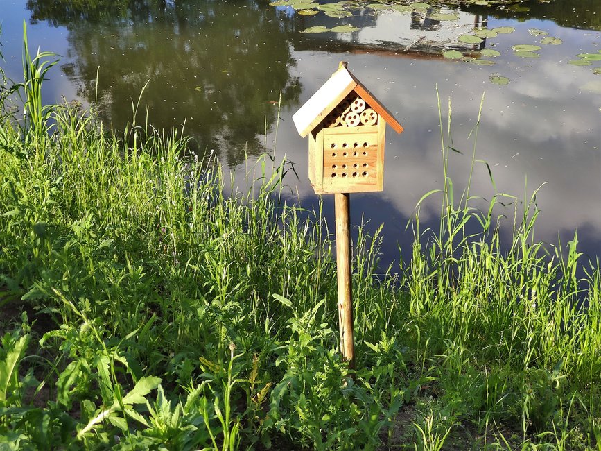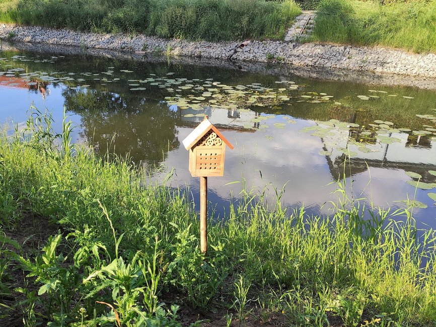Dwa dni temu prezentowaliśmy łąki kwietne na kościańskim bulwarze (link), dziś pokazujemy zamontowane wśród kwiatów domki dla pszczół, motyli, biedronek i innych owadów. Na drzewach pojawiły się budki lęgowe dla ptaków, a na ziemi przy mostkach budki dla kaczek.