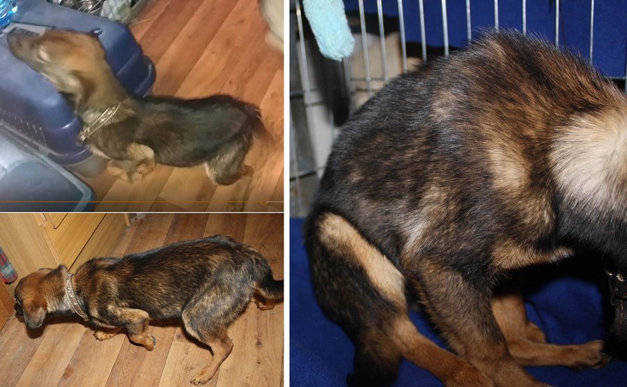 Najgorzej jednak sprawa miała się z psami. Większość z nich była krytycznie wychudzona, spod skóry wystawały żebra i kręgosłupy. Jeden z psów uwiązany był tak ciasno i wysoko, że nie miał możliwości stanąć na 4 łapach! WISIAŁ W POWIETRZU desperacko szukając podparcia. Kolejny przebywał w KOSZU NA PRANIE! Pełnym zaschniętych, starych odchodów, oczywiście również bez wody. Następny w maleńkim transporterze, kolejny szczeniak w niewielkiej klatce. Każdy z nich brodził w odchodach (...). Wszystkie zwierzaki trzymane w zamknięciu zachowywały nienaturalną pozycję ciała. Szczeniak doznał przykurczu mięśni! Świadczy to o tym, że takie przetrzymywanie nie było chwilowe. (...)