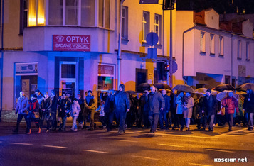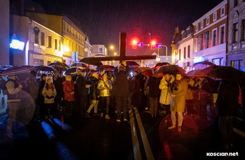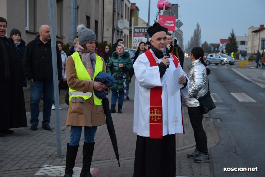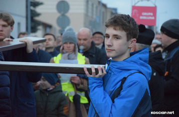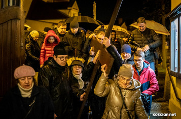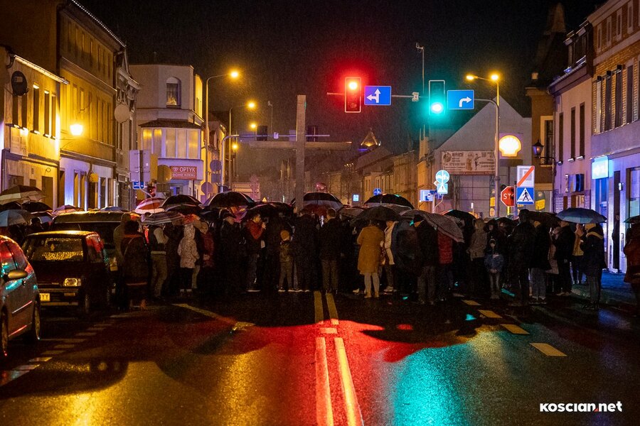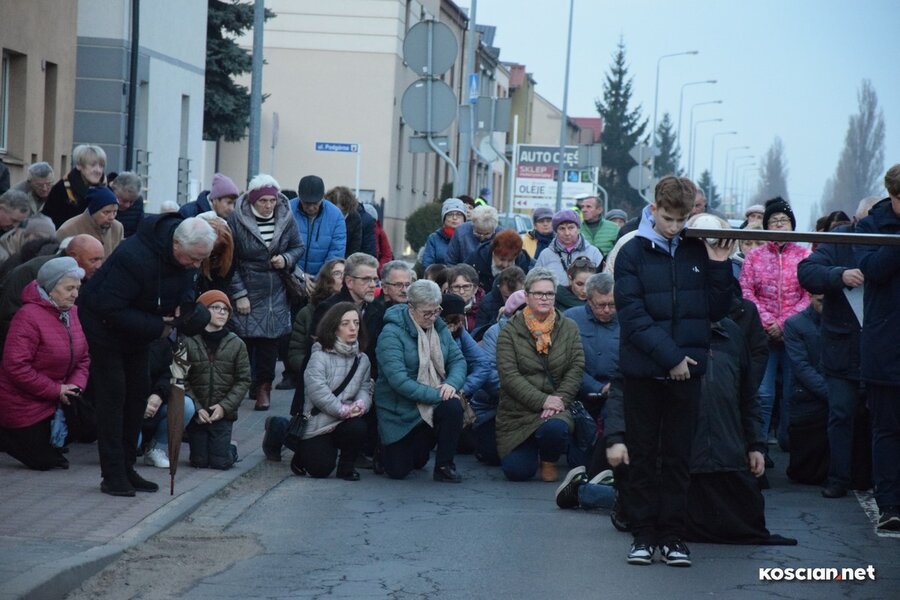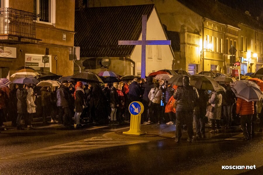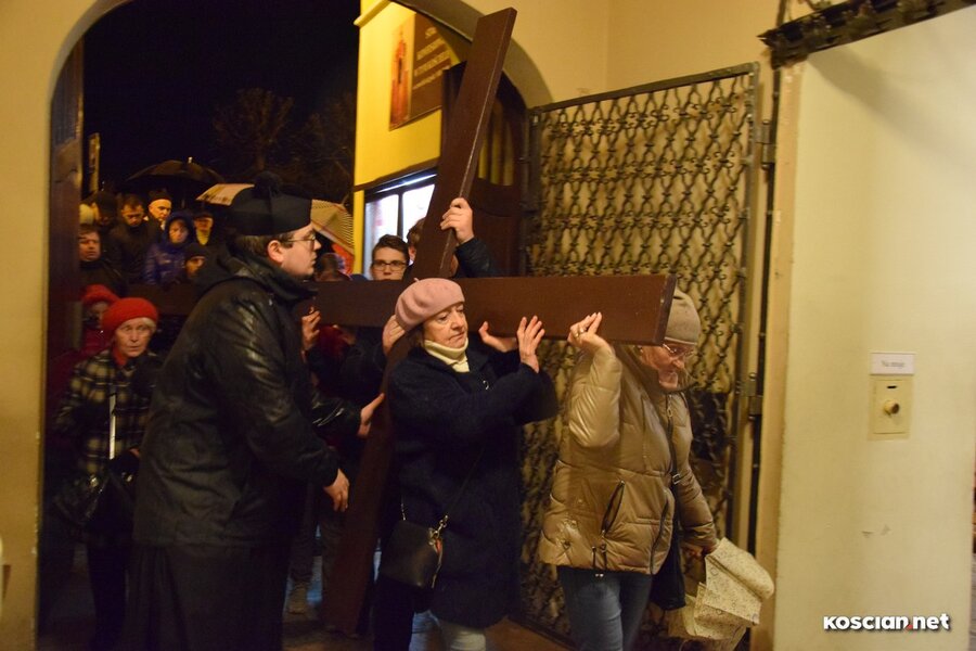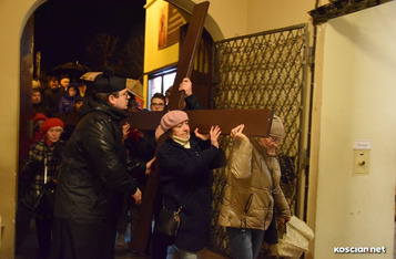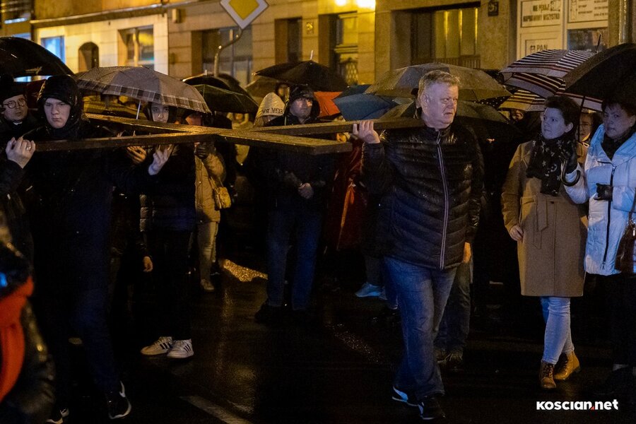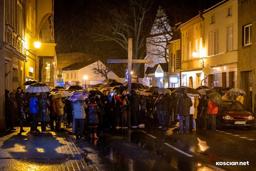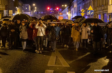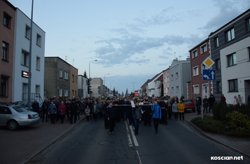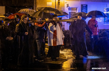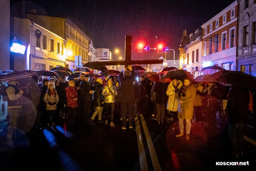 Nabożeństwo Drogi Krzyżowej rozpoczęło się o godz. 19.30 przy Krzyżu na ul. Poznańskiej. W strugach deszczu wierni i kapłani kościańskich parafii przeszli ulicami Poznańską, Piłsudskiego i Rzemieślniczą do kościoła pod wezwaniem Pana Jezusa.