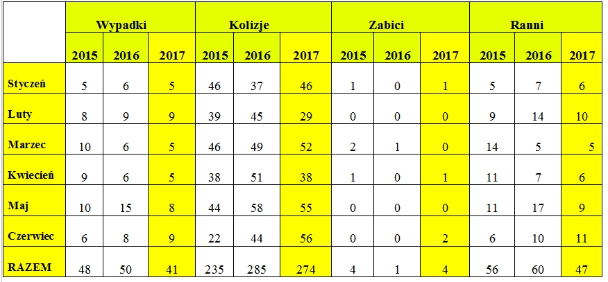 W ocenianym okresie (w relacji z I półroczem 2016) odnotowaliśmy: wzrost ilości wypadków ze skutkiem śmiertelnym z 1 do 3 oraz ilości osób, które poniosły w wyniku tych wypadków śmierć z 1 do 4. Odnotowaliśmy natomiast mniejszą ilość osób rannych w wypadkach - o 13.