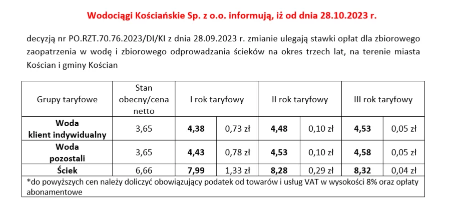 Poniżej nowa taryfa Wodociągów Kościańskich, która wejdzie w życie już w najbliższą sobotę.