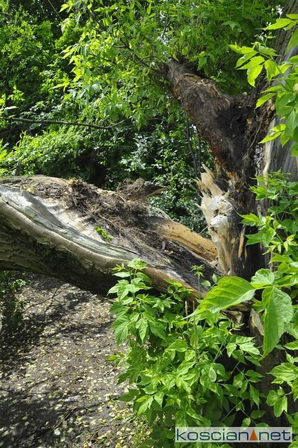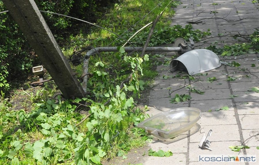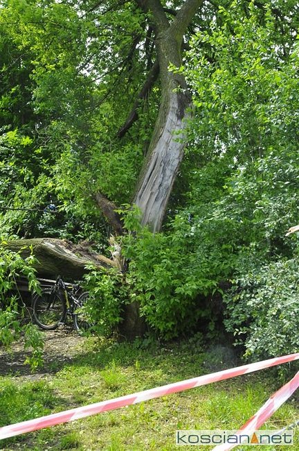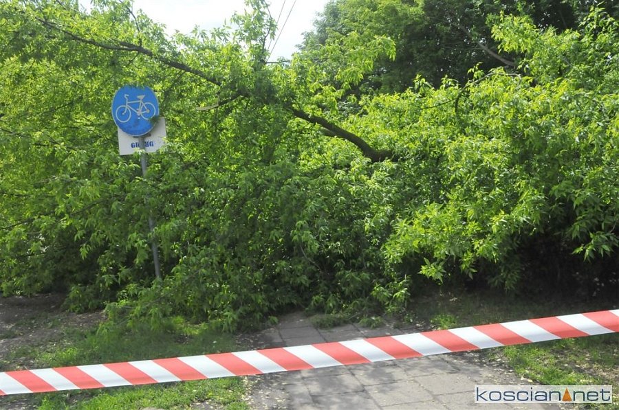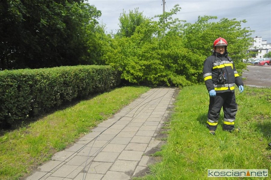 Do zdarzenia doszło w czwartek, 23 maja, po godzinie 13.30 na ulicy Towarowej w Kościanie. Rosnące przy ulicy drzewo złamało się, a upadający konar zerwał przewody zasilające uliczne oświetlenie. Przewód uderzył w przechodzącą 84-letnią kobietę. Na szczęście sieć nie była pod napięciem. Poszkodowaną przewieziono do szpitala na badania.