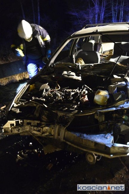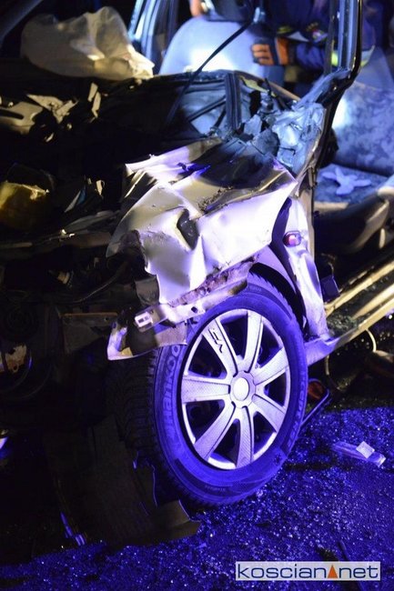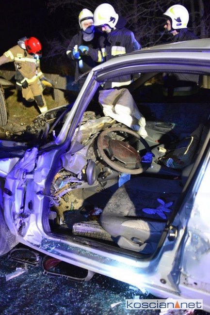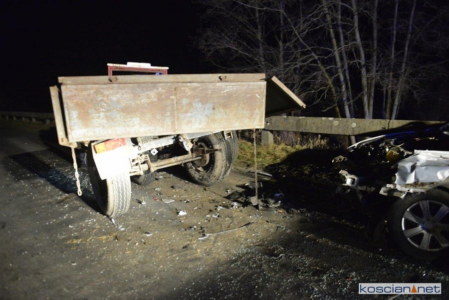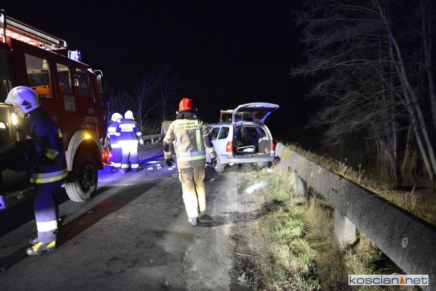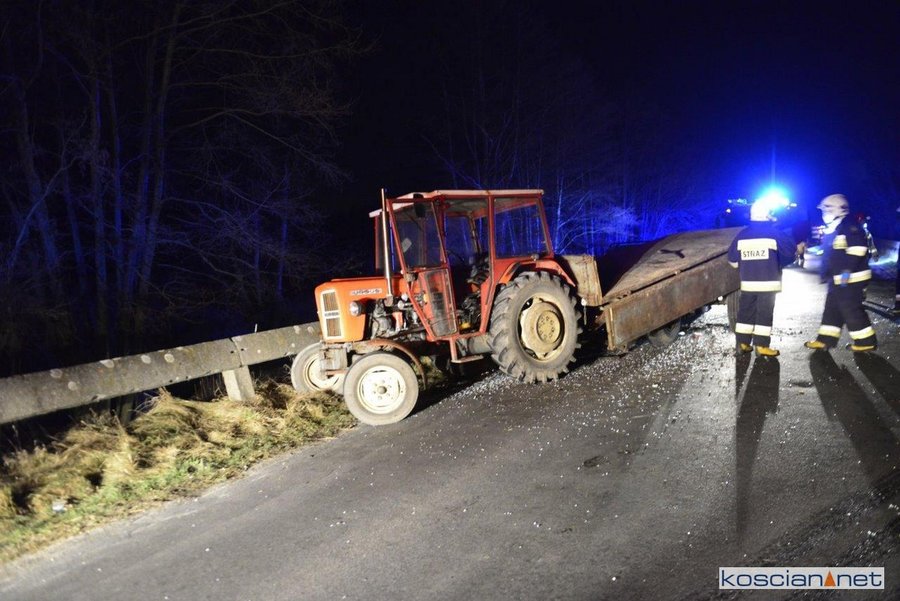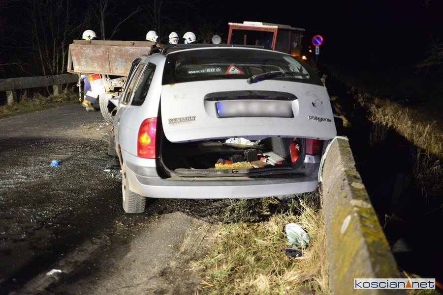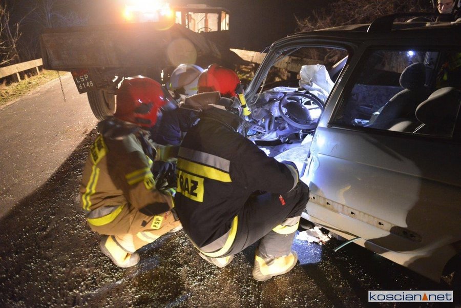 Do wypadku doszło w sobotę, 20 lutego, około godziny 19.30, na drodze z Wonieścia do Gryżyny. Kierowca renault megan wjechał w tył przyczepy ciągnika rolniczego. W wyniku zderzenia w samochodzie osobowym zakleszczony został kierowca. Z pojazdu wydobyli go strażacy. Ranny został także mężczyzna, który stał w pobliżu przyczepy. Obu poszkodowanych przewieziono do szpitala. Okoliczności i przebieg zdarzenia ma wyjaśnić policyjne dochodzenie.