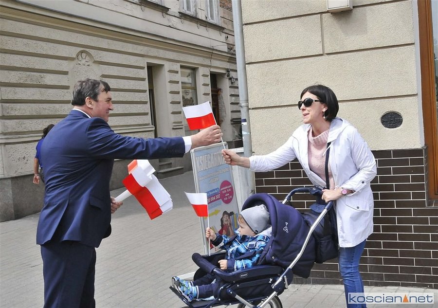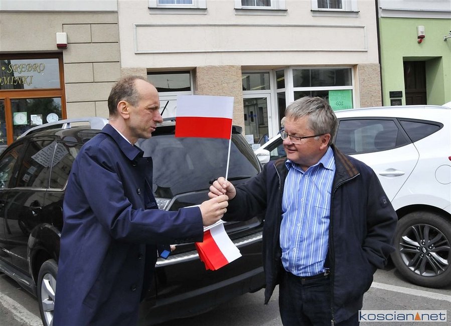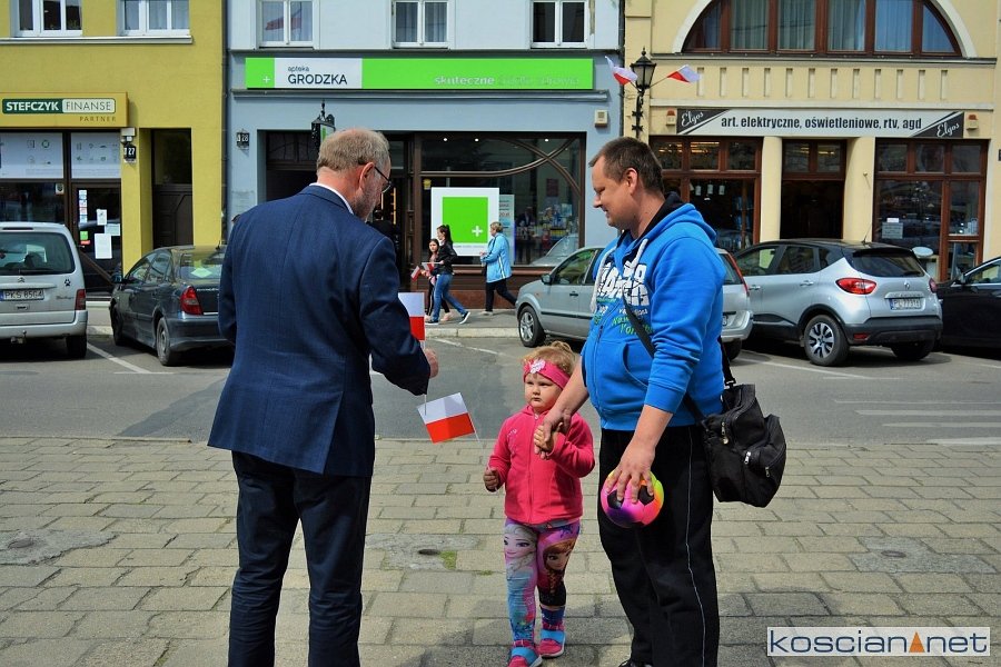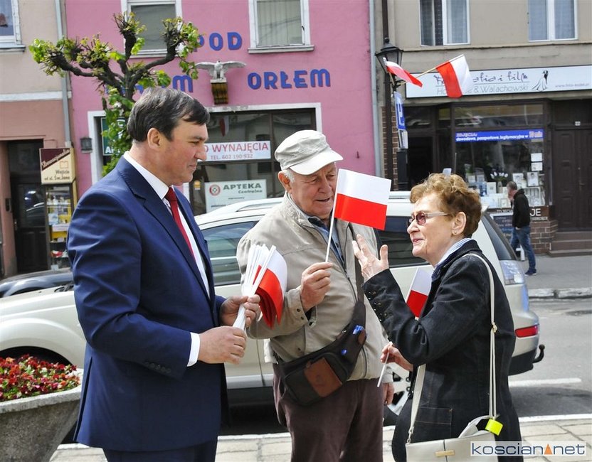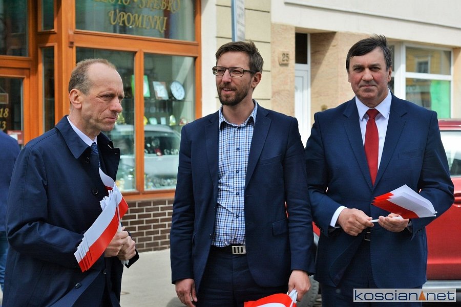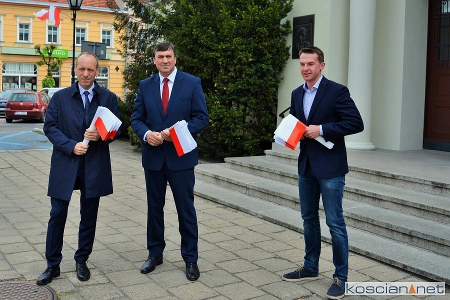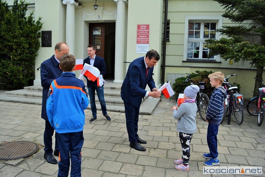 Chorągiewki rozdawali samorządowcy: Przewodniczący Rady Miejskiej Kościana Piotr Ruszkiewicz, wiceprzewodniczący rady Maciej Zielonka, burmistrz Michał Jurga, wiceburmistrz Maciej Kasprzak oraz posłowie: Adam Szłapka i Wojciech Ziemniak.